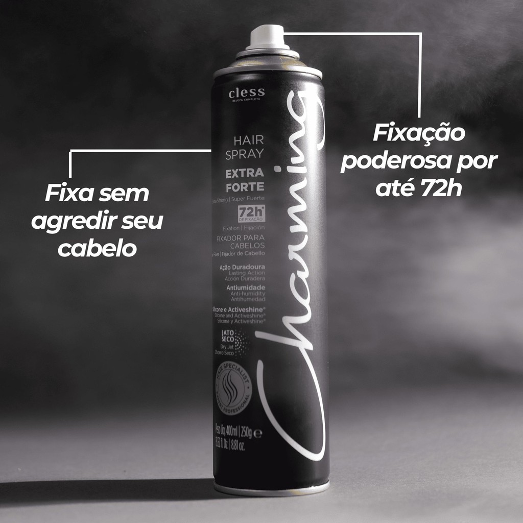 Mousse Modeladora Charming Extra Forte140ml: O mousse Charming Extra forte, modela fixa, estiliza e texturiza o cabelo facilitando a preparação montagem e finalização de diferentes tipos de cabelo. Hair Spray Charming Extra Forte 400ml: O Hair Spray Charming Extra forte é indispensável na bancada dos profissionais de cabelo. Oferece jato seco, fixação prolongada e duradoura. Ideal para texturização, montagem e finalização para penteados mais elaborados em diferentes tipos de cabelos.