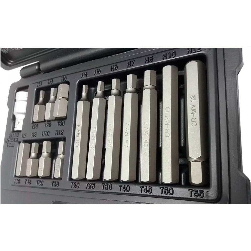 JOGO DE BITS ALLEN DESCRIÇÃO: Jogo de Bits Pontas Allen Hexagonal H4, H5, H6, H7, H8, H10 e H12, em Aço Cromo vanádio com 15 Peças 11313 Stels ESPECIFICAÇÕES: Marca: Stels; Referência: 11313; Material: Aço Cromo Vanádio 50-53 HRc; Haste Sextavada: 10mm; 07 Bits Hexagonais de 30 mm: H4, H5, H6, H7, H8, H10 e H12; 07 Bits Hexagonais de 75 mm: H4, H5, H6, H7, H8, H10 e H12; 01 Adaptador 1/2" x 10mmx 01 Maleta. - FERRAMENTA