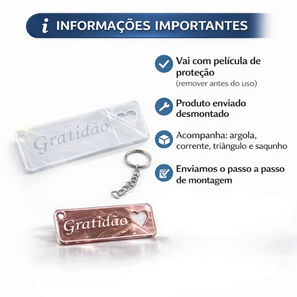 ✨ Chaveiro em Acrílico “Gratidão” – Delicado e Cheio de Significado 💛 O chaveiro em acrílico Gratidão é uma peça charmosa e versátil, perfeita para quem gosta de presentear ou criar produtos com mensagem positiva e visual elegante. Seu design moderno traz a palavra Gratidão com coração vazado, transmitindo carinho, fé e boas energias em cada detalhe. Produzido em acrílico de 2mm, possui ótimo acabamento, recorte preciso e cores bonitas, ideais para uso pessoal, lembrancinhas, brindes ou revenda. 📏 Informações do produto Material: Acrílico Espessura: 2 mm Tamanho: 5 x 2 cm Escrita: “Gratidão” com coração vazado Vai com película de proteção na frente (remover após montagem) 🎨 Cores disponíveis: Rosé Transparente Azul Dourado 🔧 Envio e montagem: Produto enviado não montado Acompanha: argola, corrente, triângulo e saquinho Enviamos o passo a passo de como montar, de forma simples e prática 🎁 Ideal para: Lembrancinhas Datas especiais Uso pessoal (chaves, bolsas, mochilas) Revenda e artesanato Uma peça pequena no tamanho, mas grande no significado 💫 Perfeito para espalhar gratidão em todos os momentos! 💖✨