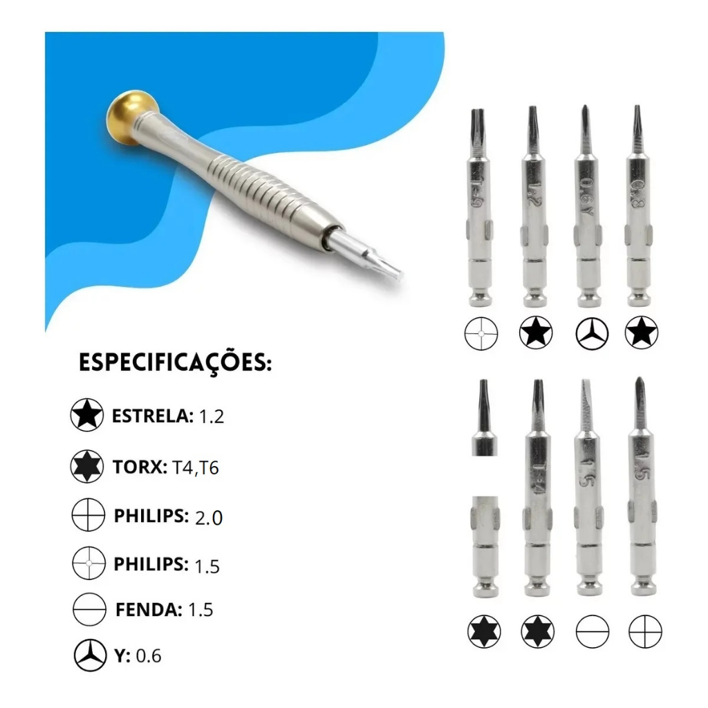 Kit muito útil para qualquer técnico profissional ou pessoa que quer reparar qualquer dispositivo eletrônico tais como celular, smartphone, tablets entre outros. Perfeito para o uso no dia a dia. Fácil de transportar e usar. Cabe no bolso. Este é um estojo com um conjunto de ferramentas para abertura com chaves universais de fenda ideal para abrir e reparar telefones celulares smartphones, tablet, ipad e praticamente qualquer outro dispositivo eletrônico. Material de alta durabilidade em aço com acabamento perfeito. Estojo em plástico. Chave com cabo ergonômico de pegada fácil. Enviado aleatoriamente azul ou laranja Informações Técnicas: - Cabo de aço (10cm) Azul - Pontas - Fenda : 1.5 - Torx : T4/T6 - Phillips : +2.0/ +1.5 - Y : 0.6 - Estrela : 0.8/1.2 Itens Inclusos: Kit Chave de Precisão 8 Em 1 ENVIO PELA TRANSPORTADORA : Enviamos produto em 1-2 dias uteis após pagamento confirmado,exceto feriados e final de semana .Produto À pronta entrega. ENTREGA: Produto chega rapidamente nas regiões centrais , ou perto de SP , já nos casos regiões remotas ou interiores, vai demorar um pouco a mais . Tempo de entrega é totalmente dependendo da transporte shopee, a entrega feito por forma de transportadora shopee ,mas cliente sempre consegue rastrear seu pedido pelo aplicativo shopee no rastreamento ,ou entre contato com central de ajuda e falar com um atendente para pegar todas informações sobre do pedido . Nós e a plataforma shopee estamos ajudando nossos clientes para sempre ! DEVOLUÇÃO : Cliente pode realizar devolução e reembolso dentro do prazo da plataforma shopee ,após o pedido concluído somente com central do shopee para resolver . Qualquer dúvida pode entre contato com nosso atendimento ao cliente na loja! Nós respondemos dentro de 1-10h e sempre responder mais rápido possível! Obrigada!
