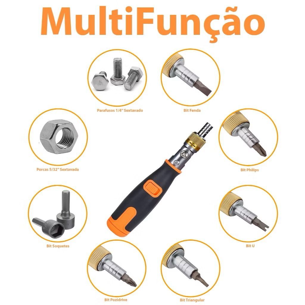 Esta incrível chave multifunção, pode ser usada como chave canhão para colocar ou retirar parafusos com cabeça sextavada de 1/4" e porcas sextavada de 5/32" em locais de difícil acesso, além de poder usar bits de 1/4", se transformando em uma chave de fenda, philips, torx, U, Y, triangular, Pozidriv, entre outras, e ainda é possível usar bits Soquete aumentando muito mais as suas funções. A chave catraca articulada é perfeita para realizar trabalhos em locais de difícil acesso, espaços estreitos ou que necessitem de inclinação. Sua cabeça articulada é inclinável, sendo possível movimentá-la em um ângulo de até 180º para cada lado, possibilitando o usuário escolher até 5 posições diferentes. Basta apertar o botão e girar a cabeça da chave no ângulo desejado. Essa chave foi desenvolvida para agilizar e facilitar o usuário de apertar um parafuso repetidamente sem reposicionar a ferramenta a todo momento, feita com Aço e modo reversível(Positivo e negativo), podendo ser usada em sentido horário e anti-horário. Possui cabo ergonômico emborrachado antiderrapante para maior aderência e conforto. É resistente a óleo e corrosão. Com 24 dentes e encaixe magnético, é garantido que o bit seja travado com segurança durante o uso e removido de maneira rápida e fácil para troca de bit. Com o encaixe magnético os bits ficam presos sem a necessidade de ficar rosqueando e desrosqueando para a troca deles, facilitando a troca e agilizando o trabalho. COMPARTIMENTO DISCRETO DE BITS: Evite perder seus bits ou esquecer de levá-los para realizar um serviço !! Com o novo design inovador da chave catraca, é possível armazenar até 10 bits para uma ampla variedades de serviços, para pega-los basta deslizar o botão. Com os 10 bits inclusos é possível lidar com uma grande variedade de cenários de manutenção e reparo. INFORMAÇÕES TECNICAS: - Cabeça de chave ajustável permite que a catraca gire 180 graus para cada lado, com 5 posições diferentes. - Mecanismo de catraca reversível, possui 3 modos para alternar entre operação no sentido horário, travado e anti-horário. - Encaixe magnético de bits hexagonal com 6,35mm. - Compartimento discreto de armazenar bits. - Kit com 12 peças: 01 Chave, 01 case e 10 bits. Pacote Inclui: 01 Chave Catraca Multifunção. 01 Case de armazenamento 10 Bits: Philips: PH0, PH1 e PH2 Fenda: 3.0, 5.0 e 6.0 Chave U: 6.0 Formato Triangular: 2.3 Formato Y: Y3.0 Pozidriv: Pz2 COR: AMARELO E PRETO