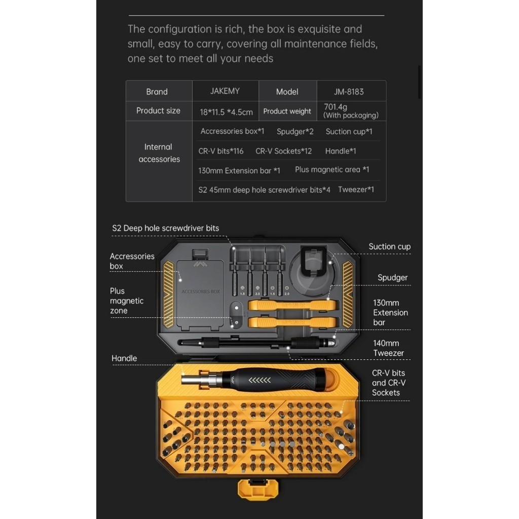 Características: Conjunto de chaves de fenda 145 em 1: bits de chave de fenda, soquetes, barra de alavanca, ventosa, pinças, etc., o kit de ferramentas tem todos os acessórios possíveis que você pode precisar para manter um smartphone, laptop e outros produtos eletrônicos. 116pcs Bits de chave de fenda: incluindo hex, cabeça cruzada, torx, fenda, pentalobe, Bits de chave de fenda de aço cromo-vanádio CRV: com fosfatação e antiferrugem tratados na superfície, dureza firme e alta. Eixo flexível e magnetizador: um eixo macio para flexão flexível para o ângulo conforme necessário. E o magnetizador é um bônus quando os bits precisam de mais magnetismo. Chave de fenda ergonômica: a cabeça da chave de fenda tem magnético para segurar o bit firmemente, lidar com antiderrapante projetado e tampa giratória de 360° para operação conveniente. outros acessórios firmemente, eles não vão cair fora da caixa. especificações: Material: CRV Tamanho do item: 180 * 115 * 45 mm/7,09 * 4,53 * 1,77 polegadas Peso do item: 702g/24,76 oz Peso do pacote: 715g/25.22oz Tamanho do pacote: 18,5 * 10,5 * 4,5 cm/7,28 * 4,13 * 4,77 in Lista de embalagem: 116 * Bits de chave de fenda 12 * Soquete 5 * Pá triangular 4 * S2 45mm Bits longos 2 * Ferramenta de alavanca 1 * Ventosa 1 * Pinça 1 * Magnetizador 1* Eixo flexível 1 * Alça 1* Caixa de acessórios 1* Case