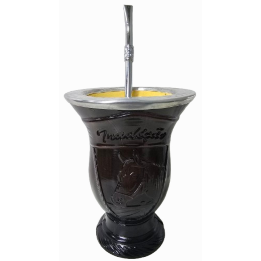Cuia para Chimarrão Taça Injetada. Conjunto 1 Cuia chimarrão Porongo Natural com revestimento em plástico injetado com desenho cavalo e bocal de alumínio + bomba para chimarrão(bomba simples metal polido detalhes na bomba conforme disponibilidade em estoque prata ou dourado). 500 Gramas Erva para Chimarrão ( Escolher variação) As cuias são produzidas artesanalmente a partir do Porongo (cabaça) que é um produto natural portanto o tamanho e a coloração têm variação, CADA CUIA É UM PRODUTO ÚNICO e pode conter algumas imperfeições e fissuras, o que não desvaloriza o produto. Imagens com mais de uma cuia apenas para visualização das cores será enviado apenas 1 cuia e 1 bomba. • Tamanho: entre 15cm à 16cm • Bocal: entre 11cm à 12cm • Capacidade: em média 300ml • Peso: aproximadamente 300g CONSERVAÇÃO: Após utilizar a cuia, retire todos resíduos internos de mate e lave em água corrente. Não utilize produtos abrasivos. Utilize somente detergente neutro. Secar bem o produto antes de guardar. Guardar em local seco e arejado. É importante manter a cuia guardada sempre seca.