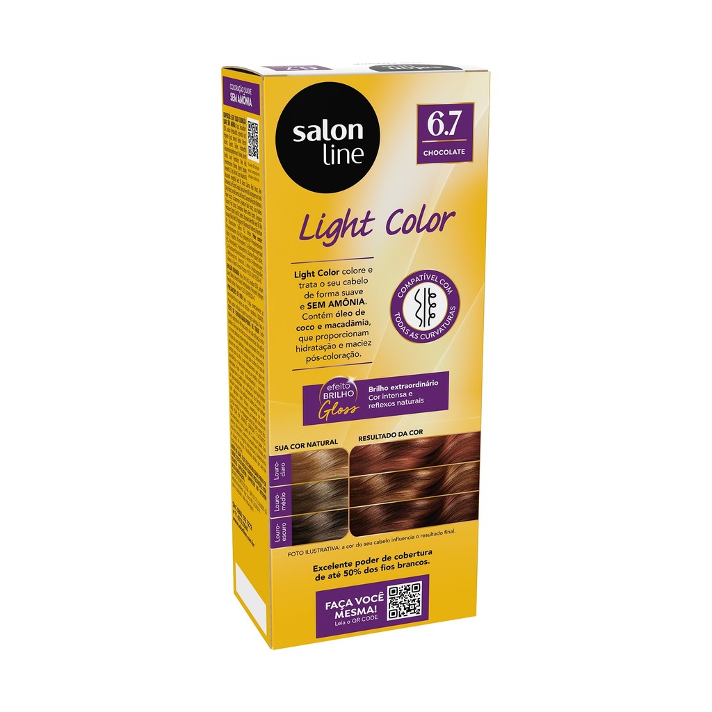 O kit contém 1 Coloração Light Color 6.7 Chocolate e 1 Máscara Matizadora Chocolate 300 g, a dupla ideal para colorir e manter a tonalidade dos fios com brilho intenso, cor vibrante e acabamento uniforme. <>INDICAÇÕES$& Para quais tipos de cabelo? Para cabelos ondulados e lisos. Qual a indicação? coloração, tingido e manutenção de cor Pode usar a partir de quantos anos? Não recomendado para crianças. <>ATIVOS$& Quais os principais ativos? Coloração Light Color 6.7 Chocolate A fórmula exclusiva da Coloração Light Color Chocolate é sem amônia e enriquecida com Óleo de Coco e Macadâmia para tratar e proteger a fibra capilar, deixando os cabelos revitalizados, sedosos e com brilho intenso. Máscara Matizador Chocolate Meu Liso Manteiga de Cacau: promove nutrição profunda e ajuda a tratar danos externos. Óleo de Avelã: rico em propriedades emolientes e antioxidantes, proporciona maciez e brilho intenso. <>MODO DE USO$& Qual a melhor forma de usar? Máscara Matizador Chocolate Meu Liso Com o cabelo limpo e úmido, aplique a máscara mecha a mecha, espalhando bem do comprimento às pontas. Massageie suavemente e deixe agir de 5 a 10 minutos, de acordo com a intensidade desejada. Em seguida, enxágue bem. O resultado pode variar conforme a cor e o tom do cabelo, além do tempo de ação do produto. Dicas Extras: Faça sempre o teste de mecha antes da aplicação para garantir o tom desejado. O uso contínuo ajuda a manter a cor vibrante e o brilho por muito mais tempo. Coloração Light Color 6.7 Chocolate Preparação da mistura 1. Desembarace e molhe os cabelos com água, sem lavá-los. 2. Enxugue-os cuidadosamente. Caso os cabelos possuam resíduos de gel, mousse, etc ou estejam oleosos, lave-os com shampoo Salon Line. 3. Coloque as luvas. 4. Com um pincel, misture bem em um recipiente não metálico o conteúdo da bisnaga de coloração Light Color de 45g com 90ml de Emulsão Ativadora Salon Line até obter uma consistência homogênea e cremosa. 5. Utilize a mistura imediatamente e não guarde sobras. Aplicação/tempo de ação em cabelos naturais Aplique a mistura uniformemente nos cabelos mecha por mecha, na raiz, comprimento e pontas. Para cabelos finos, louros, avermelhados, permanentados, alisados e relaxados, deixe a mistura agir por 15 minutos. Para cabelos normais, grisalhos e escuros, deixe a mistura agir por 20 minutos. Aplicação/tempo de ação em aplicações subsequentes Aplique na raiz dos cabelos por 15 minutos e no comprimento e pontas somente nos últimos 5 minutos, totalizando o tempo de ação de 20 minutos. Enxágue Após o tempo de ação, enxágue abundantemente até que a água corra límpida. Não é necessário usar shampoo. Aplique o Condicionador Salon Line e deixe agir por 3 minutos. Enxágue abundantemente. Dicas de uso Antes de iniciar a aplicação, passe um pouco de creme hidratante na testa (próximo aos cabelos), orelhas e nuca para facilitar a retirada da coloração e evitar que a pigmentação manche sua pele. Salon Line recomenda Antes da aplicação, é importante realizar o teste de sensibilidade e o teste de mecha para detectar possíveis reações adversas e determinar o tempo de aplicação do produto e o resultado da cor. Por isso, não deixe de conferir a bula que acompanha a Coloração Light Color. <>CARACTERÍSTICAS$& É produto vegano? Nenhum dos itens são veganos. É liberado? Todos os itens são liberados.