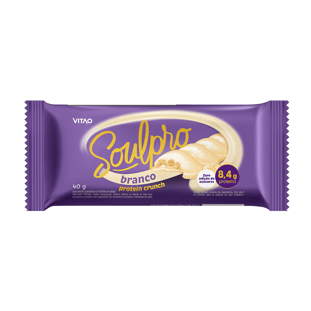 O chocolate branco SoulPro Proteico Zero Açúcar é uma opção deliciosa e saudável, feito com ingredientes de alta qualidade. Além de proporcionar o sabor irresistível do chocolate branco, destaca-se por ser rico em proteínas, oferecendo 8,4g por porção. Essa escolha nutritiva e sem açúcares é perfeita para quem busca um deleite saboroso e ao mesmo tempo saudável. INGREDIENTES: Manteiga de cacau, concentrado proteico de soro de leite leite em pó desnatado, edulcorante maltitol, crispies proteicos, emulsificante lecitina de soja, estabilizante poliglicerol polirricinoleato e aromas. ALÉRGICOS: CONTÉM DERIVADOS DE LEITE, SOJA E PODE CONTER AMÊNDOA, CASTANHA-DE-CAJU E AVELÃ. NÃO CONTÉM GLÚTEN. CONTÉM LACTOSE. SEM GLÚTEN, ZERO ADIÇÃO DE AÇÚCARES, PROTEICO.