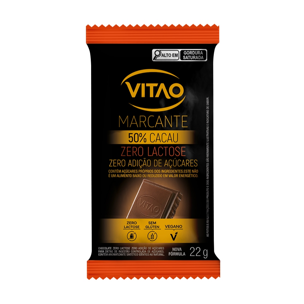 O chocolate Vitao Marcante 50% Cacau zero lactose e zero açúcares é a combinação perfeita de um sabor incrível e uma textura macia e irresistível. Cada pedacinho derrete na boca, deixando um gostinho irresistível e despertando o desejo de saborear mais a qualquer hora do dia. INGREDIENTES: Liquor de cacau, manteiga de cacau, gordura vegetal, edulcorante maltitol, emulsificante lecitina de soja, estabilizante poliglicerol polirricinoleato e aromas. ALÉRGICOS: CONTÉM DERIVADOS DE SOJA. PODE CONTER AMÊNDOA, CASTANHA-DE-CAJU, CASTANHA-DO-PARÁ, AVELÃ E AVEIA (SEM GLÚTEN). NÃO CONTÉM GLÚTEN. NÃO CONTÉM LACTOSE. SEM GLÚTEN, ZERO ADIÇÃO DE AÇÚCARES, ZERO LACTOSE, VEGANO.