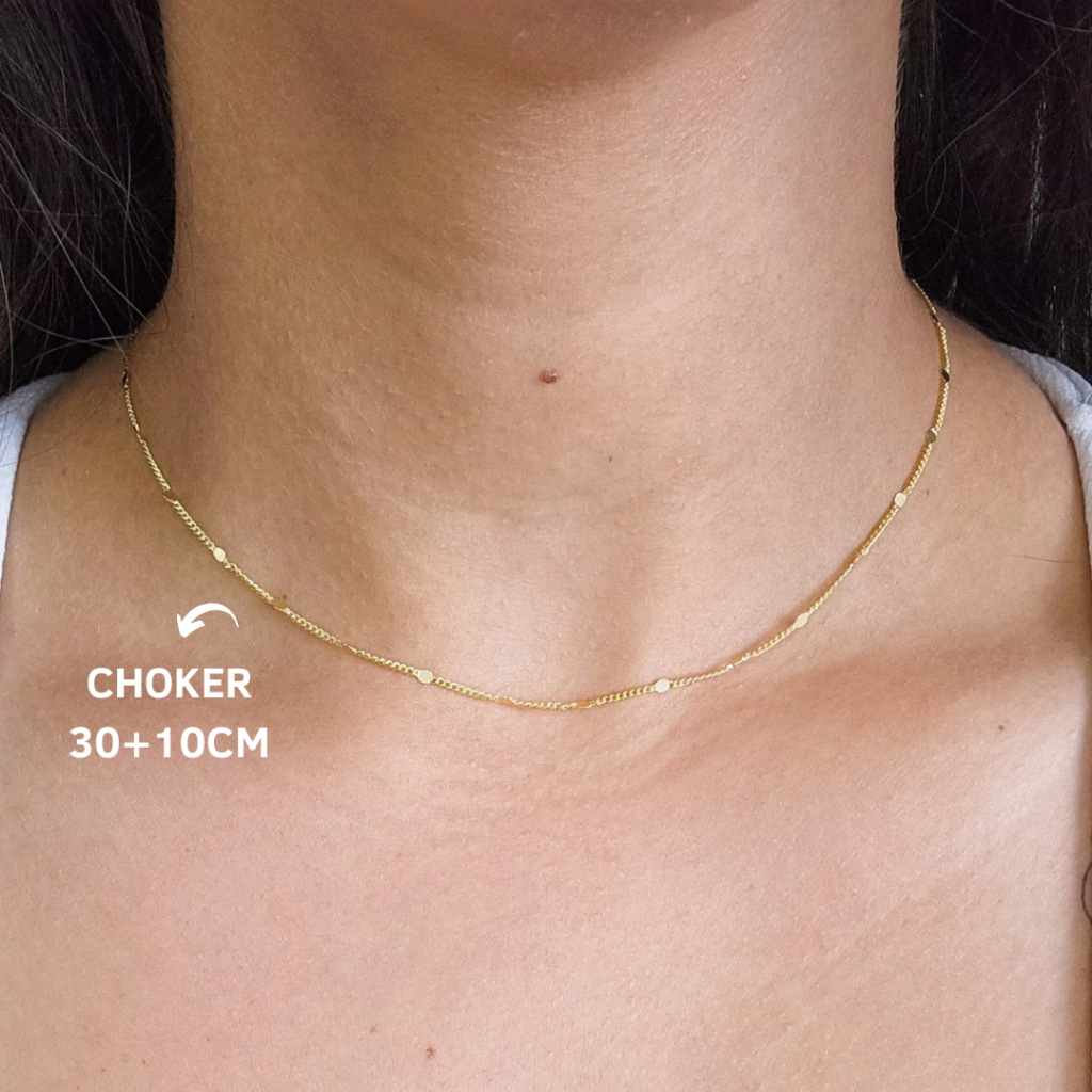 Tamanho do Colar: 70 cm Tamanho da Choker: 38 cm + 10 cm de extensorPerfeito para quem ama acessórios femininos e modernos. As pequenas chapinhas refletem a luz com sutileza, trazendo um toque de brilho e movimento que valoriza qualquer look, do casual ao sofisticado