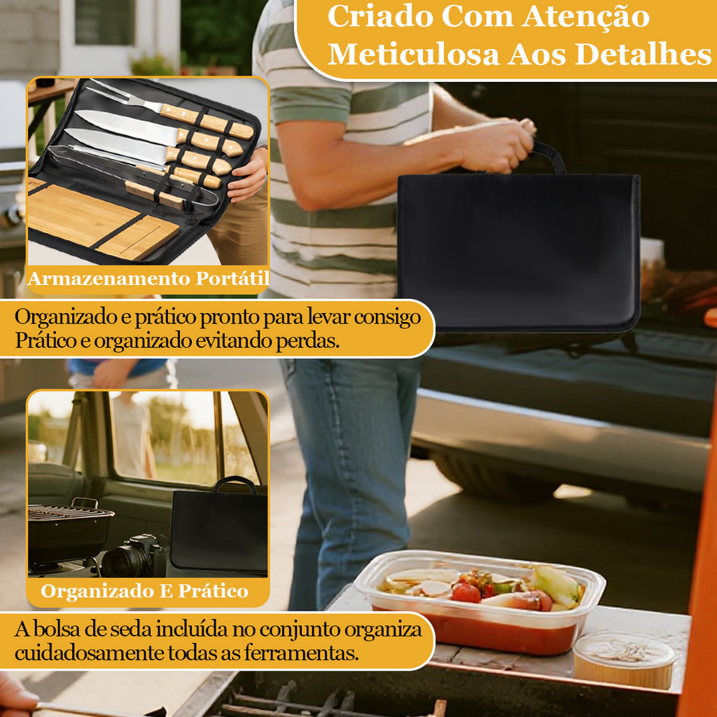 Churrasco Perfeito na Palma da Sua Mão: O Kit Completo e Estiloso para o seu Momento Saboroso! Eleve o seu ritual de churrasco com mais praticidade e estilo! Nosso kit de 6 peças foi desenvolvido para quem exige durabilidade, organização e alto desempenho na hora de grelhar. Tudo isso, armazenado com elegância em uma prática necessete de nylon preta, para você levar o seu kit de churrasco para qualquer lugar. Imagine ter tudo o que você precisa, organizado e ao alcance das mãos: este conjunto é a solução completa para o seu churrasco, unindo o charme rústico do bambu à alta resistência do aço inoxidável. Destaques que fazem a diferença: Design Ergonômico e Estiloso: Cabos em madeira natural, um material resistente com um toque rústico e confortável, que oferece a melhor pegada e conforto durante o uso. Máxima Resistência e Durabilidade: Lâminas e componentes em aço inoxidável de alta qualidade, garantindo que não enferrujam. A estrutura é reforçada com rebites de aço inoxidável, assegurando que as peças permaneçam firmes, com máxima resistência à ferrugem e corrosão, mesmo com uso intenso e lavagens constantes. Organização e Total Portabilidade: Armazene e transporte todo o seu kit com facilidade na estilosa necessete de nylon preta. Prática, compacta e perfeita para manter tudo organizado e protegido na garagem, no carro, ou para levar em viagens e passeios. Kit Completo com 6 Peças Essenciais: 2 Facas para Churrasco: Afiadas e resistentes, perfeitas para cortes precisos na carne. Garfão para Churrasco: Ideal para virar e servir aqueles pedaços suculentos de carne com segurança. Pinça para Alimentos: Manipulação fácil e precisa, perfeita para virar pedaços menores, pegar legumes na grelha ou servir com elegância. Amolador de Aço (Afiador): Mantenha as facas do kit sempre afiadas e prontas para usar, garantindo cortes precisos a qualquer momento. Tábua de Carne em Madeira: Completa o seu conjunto para preparo e serviço. Não perca tempo com utensílios de qualidade duvidosa! Invista em um kit durável, prático e completo. Clique em "Comprar" agora e leve o seu churrasco para um novo patamar!