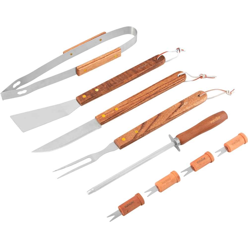 Jogo de utensílios para churrasco, em aço inox, com 10 peças, VONDER Utensílios em aço inox, proporcionando maior resistência e durabilidade. Conta ainda com cabo de madeira longo, garantindo um manuseio mais seguro contra altas temperaturas. Indicado para uso no preparo de carnes. Especificações Técnicas: Quantidade de peças: 10 peças Material da lâmina: Aço inox Material do cabo: Madeira Conteúdo Da Embalagem: 1 Jogo de utensílios para churrasco com 10 peças, sendo: 1 faca, 1 garfo, 1 pegador, 1 espátula, 1 chaira, 4 pegadores de petiscos e 1 estojo com zíper.