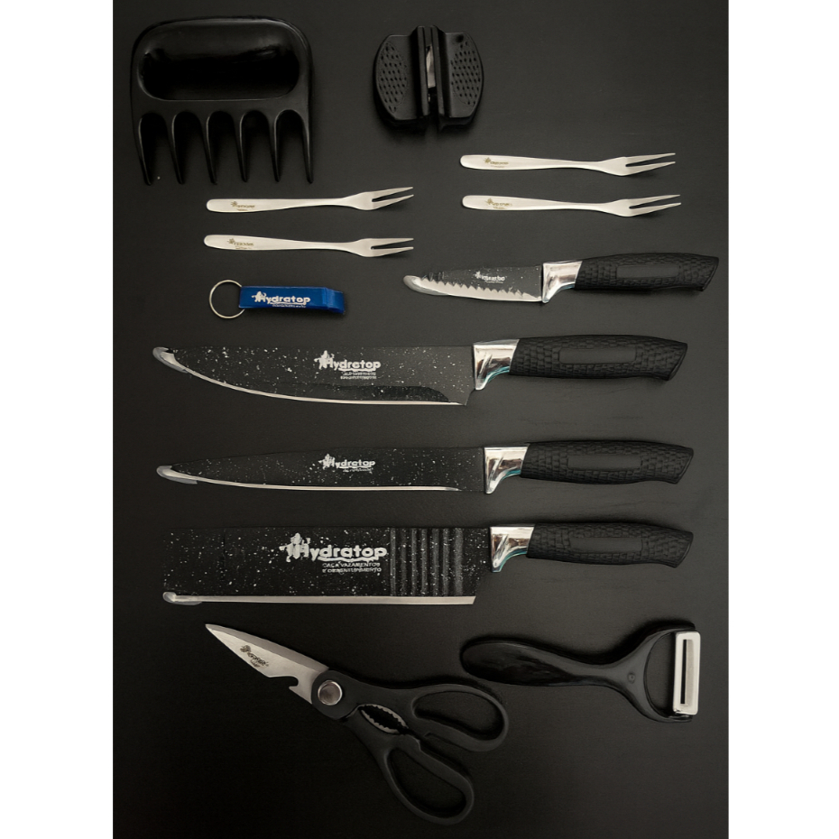 Kit de churrasco premium personalizado. 12 Peças - Item completo para Churrasco/Cozinha/Cozinha Profissional Neste KIT você escolher gravação com nome da sua empresa ou para presentes. Assim que efetuar a compra, informe o nome ou envie o seu logo para a gravação. Transforme sua experiência com este conjunto projetado para unir funcionalidade e design moderno. As lâminas onduladas em aço inoxidável de alta qualuidade, além de cortes precisos e eficientes, também oferece um visual arrojado e inovador. Com cabos de polipropileno ergonômicos e leves, estas facas proporcionam conforto durante o uso, mesmo em tarefas prolongadas. A embalagem, em papelão resistente revestido com espuma rígida, assegura armazenamento e transporte seguros. Destaques: •Lâmina: Aço inoxidável com design ondulado, combinando precisão com modernidade. •Cabo: Confeccionado com acabamento anatômico que alia sofisticação e firmeza, proporcionando cortes mais precisos. •Estojo: Caixa revestida com espuma rígida, protegendo o conjunto de forma prática e funcional. •Uso e manutenção: Lave e seque bem as peças após cada uso para manter sua durabilidade e aparência impecável. •Durabillidade, elegância e resistência em um unico KIT 01 Faca do Chefe estilo Cutelo 01 Faca do Chef 01 Faca de Corte 01 Faca de Frutas/Legumes 04 Garfos 01 Garra 01 Tesoura multifuncional 01 Descascador de Legumes 01 Afiador Prazo de produção - 2 dias úteis. Após o envio das informações, será confirmado o pedido. Obrigado Bela Granato Personalizado