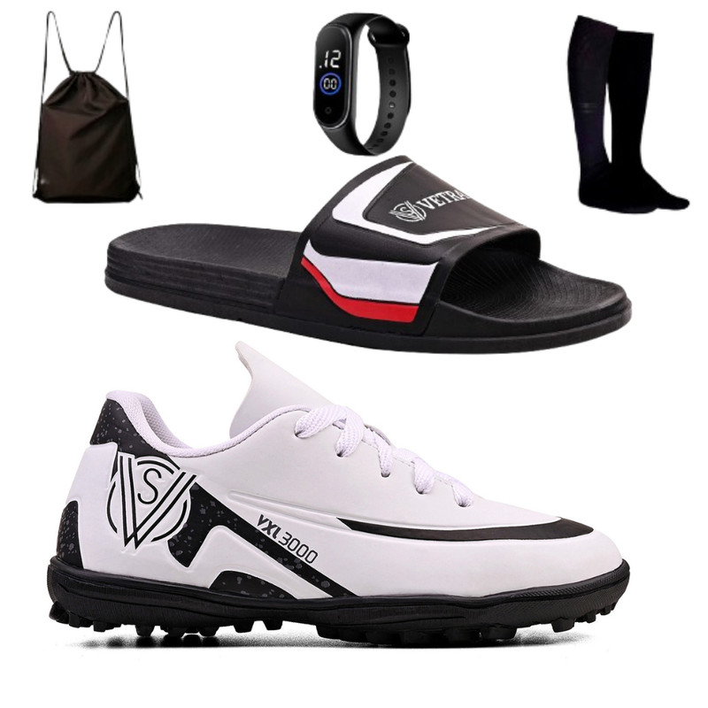 Kit Chuteira Infantil para Society Leve + Chinelo Macio Slide + Relógio + Mochila e Meião