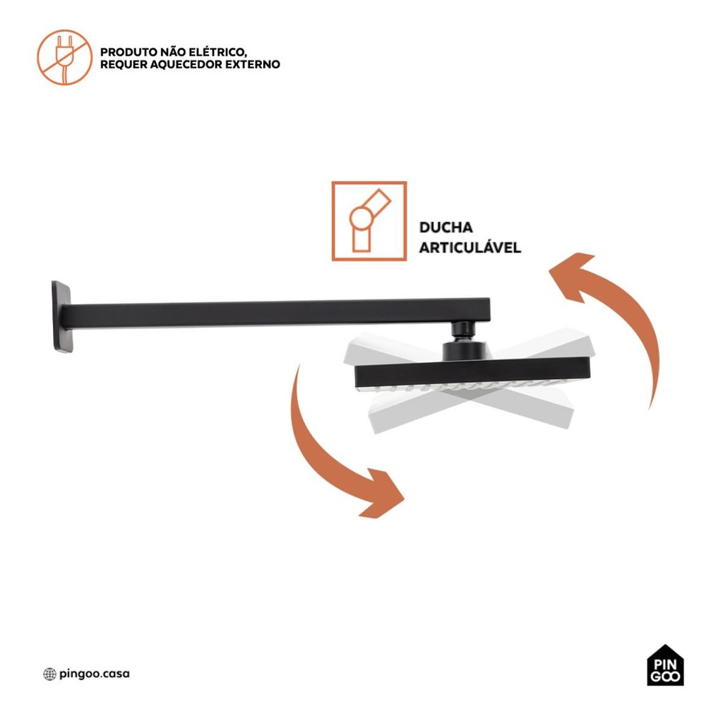 O Kit Ducha Tucuruí com Desviador Mundaú e Ducha Manual Jaci Pingoo é uma solução completa para um banho prático, moderno e elegante. A Ducha Tucuruí une conforto e tecnologia por ser produzida em ABS e aço inox 201. Os bicos de diferentes tamanhos proporcionam uma distribuição equilibrada da água, criando o efeito de “chuva natural”. Com formato quadrado e instalação de parede, é compatível com sistemas de aquecimento a gás ou solar e pressões de 5 a 40 Mpa. Este produto não é elétrico. Já o Desviador Mundaú oferece praticidade ao permitir a alternância entre saídas de água, otimizando a experiência no banho. Fabricado em latão resistente à umidade, tem instalação simples e vazão de 10,05 L/min (0,5 MPa). A Ducha Manual Jaci oferece conforto e versatilidade, com direcionamento flexível do jato de água, ideal para higienização pessoal e limpeza do box. Produzida em ABS, é resistente à umidade e ao desgaste, com vazão entre 21,28 e 27,34L/min e design moderno que combina com diversos estilos de banheiro. Chuveiro TucuruíMedidas: 47,5 cm (C) x 8,5 cm (A) x 20,0 cm (L)Cor: PretoTipo de produto: ChuveiroLocal de Uso: Banheiro ou Área externaMaterial: Tubo Aço inox 201 e Chuveiro Superior em ABSAcabamento: FoscoForma de instalação: ParedePeso do produto: 0,800 gConteúdo da embalagem: 1 Chuveiro Tucuruí, Anéis de Vedação, Sistema de fixaçãoTipo de jato: Efeito chuva naturalPressão mín e máx: 5 a 40 Mpa Desviador MundaúMedidas: 5,5 cm (C) x 2,5 cm (L) x 4,2 cm (A)Cor: PretoTipo de produto: DesviadorLocal de Uso: Banheiro ou Área externaMaterial: LatãoAcabamento: FoscoForma de instalação: ParedePeso do produto: 0,275 gConteúdo da embalagem: 1 Desviador MundaúTipo de jato: FlexívelPressão mín e máx: 0.5 MpaVazão: 10.05 L/min Ducha Manual JaciMedidas: 7,5 cm (C) x 6,5 cm (L) x 26,5 cm (A)Cor: PretoTipo de produto: Ducha ManualLocal de Uso: Banheiro ou Área externaMaterial: ABSAcabamento: FoscoForma de instalação: ParedePeso do produto: 0,344 gConteúdo da embalagem: 1 Ducha Manual JaciTipo de jato: FlexívelPressão mín e máx: 0.3-0.5 MpaVazão: 21.28-27.34 L/Min