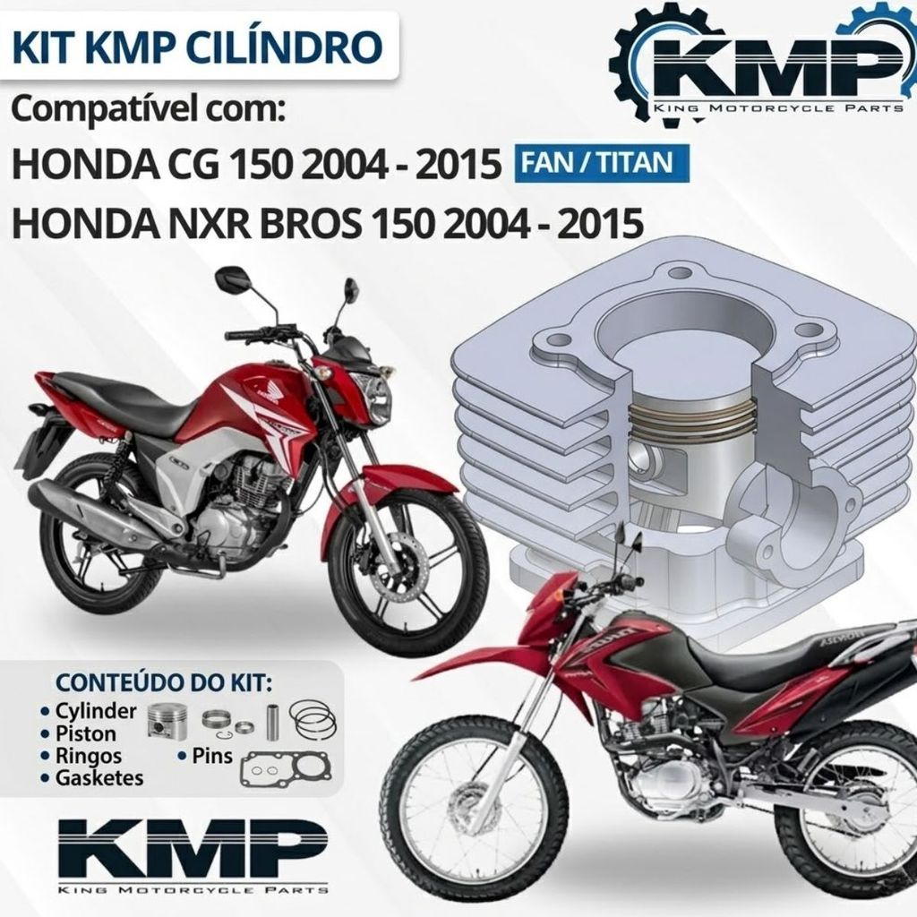 Kit de Motor Completo KMP - Linha Honda 150 (Cilindro, Pistão e Anéis) Recupere a potência original da sua moto com o Kit de Motor KMP, referência no mercado de reposição por sua durabilidade e precisão. Este conjunto foi desenvolvido seguindo rigorosamente os padrões das montadoras (OEM), garantindo um encaixe perfeito e alta performance para sua Honda. O cilindro, fabricado em liga de alumínio de alta resistência, aliado ao pistão com tratamento térmico, oferece a dissipação de calor ideal e maior vida útil ao motor, seja para uso diário no trabalho ou lazer. ### Compatibilidade Ampla: Família CG 150: Titan (KS, ES, ESD, Sport) – Modelos 2004 a 2008. CG 150 Titan & Fan: Versões Gasolina, Mix e Flex – Modelos 2009 a 2015. NXR 150 Bros: Modelos 2006 a 2008 (Exceto OHC). NXR 150 Bros: Versões Mix e Flex – Modelos 2009 a 2014. ### O que você vai receber: Cilindro do Motor (Medida Padrão STD); Pistão KMP (Acompanha pino e travas); Jogo de Anéis de alta compressão; Kit de Juntas para montagem. ### Diferenciais do Produto: Qualidade Premium: Materiais de alta qualidade (Alumínio e Aço) com acabamento superior. Pronto para Instalar: Peças com medidas idênticas às originais, sem necessidade de adaptações. Resistência Térmica: Componentes testados para suportar altas temperaturas e regimes de rotação. Segurança: Produto com garantia de 90 dias contra qualquer defeito de fabricação. Informações Importantes: Produto novo, original e com envio imediato. Recomendamos que a instalação seja feita por um profissional especializado para garantir a validade da garantia. Suporte Pós-Venda: Caso tenha qualquer dúvida ou imprevisto, utilize o campo de mensagens do seu pedido. Nossa equipe está pronta para te ajudar rapidamente! Agradecemos a preferência e boas compras!