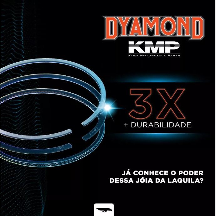 IT KMP DYAMOND COMPLETO C/CILINDRO. PISTAO. ANEL E JUNTA KIT-A CG 160 - NXR BROS 160 O kit Pistão KMP com anéis DYAMOND é um novo lançamento com uma qualidade superior a qualquer outra marca do mercado. As paredes dos anéis KMP DYAMOND possuem uma superfície com a tecnologia mais avançada, chamada DLC (diamond like carbon), que é um tratamento efetuado no anel de compressão que busca diminuir o desgaste dos anéis, devido ao tratamento nele aplicado, fazendo com que o material seja o mais rígido e superior já produzido. O tratamento DLC feito no anel de compressão para obter o aumento de resistência ao desgaste, sendo assim o DLC é uma estrutura cristalina depositada na superfície de contato do anel, ele possui uma dureza equiparável ao diamante, é um revestimento metaestáveis do carbono. O kit é um produto com foco em durabilidade e desempenho devido ao tratamento DLC, onde desde o processo de desenvolvimento do produto já surpreendeu a todos. Provoca um menor desgaste ao cilindro do motor. Diversos testes foram efetuados após finalizado o produto, identificando que ele possui uma qualidade empregada a durabilidade em 3 vezes maior que os anéis já fornecidos ao mercado. Itens incluso: 1 Cilindro encamisado. 1 Pistão Kmp 1 Kit de anéis Dyamond. 1 Jogo juntas (A).
