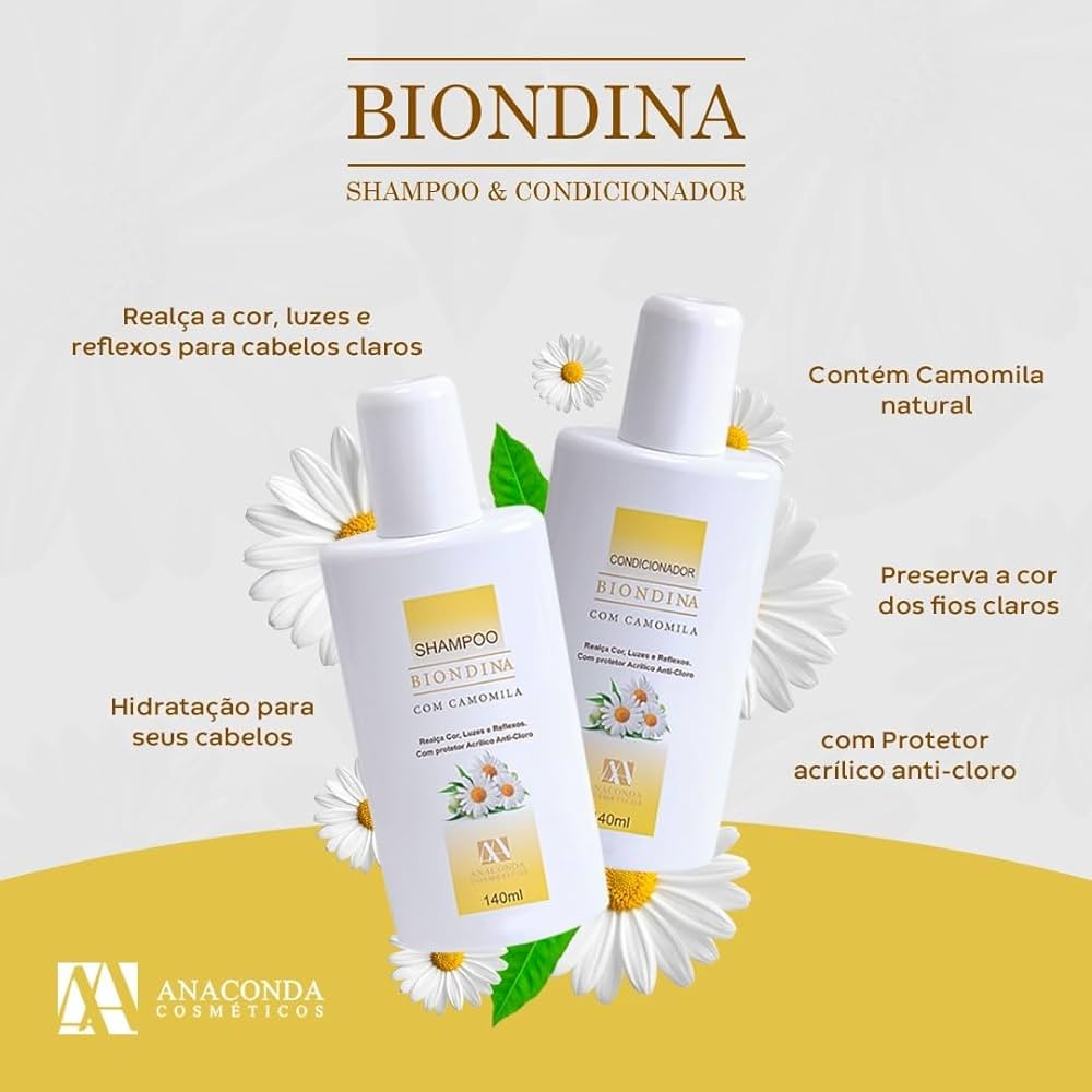 Kit Shampoo e Condicionador Biondina 140ml - Anaconda Este kit contém: 1 Shampoo Biondina 140ml - Anaconda 1 Condicionador Biondina 140ml - Anaconda Biondina Anaconda foi desenvolvido especialmente para valorizar a cor dos cabelos claros. Biondina Anaconda é indicado usar após o banho de piscina ou mar para evitar o efeito do cloro. Restaura os cabelos afetados por produtos químicos, mar, piscina e sol. Os cabelos naturalmente claros ou tingidos necessitam de cuidados para preservar seu equilíbrio e aparência saudável. Modo de Usar: Aplique nos cabelos molhados massageando suavemente e enxágue em seguida. Para melhor resultado, repita a operação. Aplicar nos cabelos molhados massageando suavemente e enxágue em seguida. Note seus cabelos ainda mais macios e fáceis de pentear. Precauções: Manter fora do alcance de crianças. Em caso de irritação, suspenda o uso.