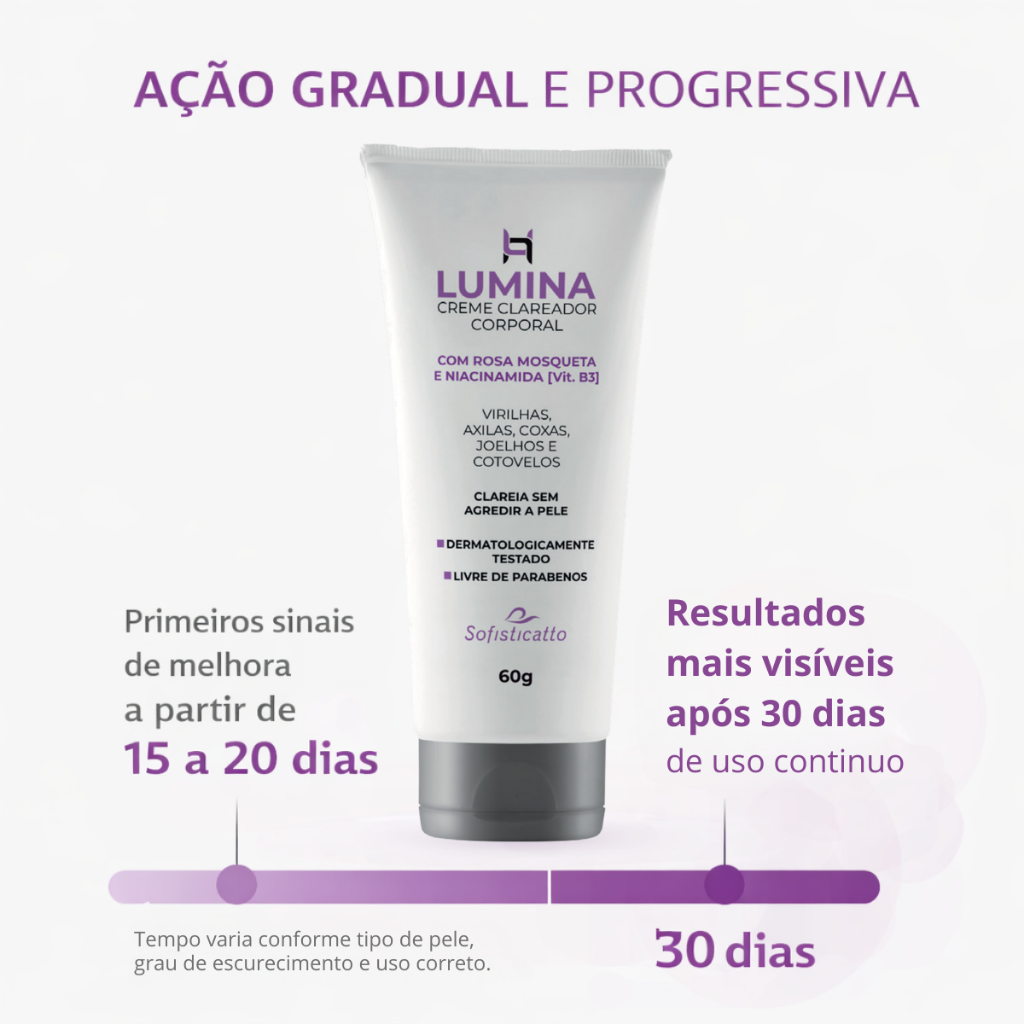 Kit Clareador Corporal Lumina Gomage Peeling + Creme Clareador Axilas Virilha Sofisticatto – Cuidado Corporal Completo O Kit Lumina Corporal Sofisticatto foi desenvolvido para proporcionar limpeza profunda, esfoliação suave, hidratação e clareamento da pele, deixando-a mais uniforme, macia e saudável. Ideal para quem busca resultados visíveis sem agredir a pele. O KIT CONTÉM: ✔ 01 Peeling Corporal Lumina – 150g ✔ 01 Creme Clareador Corporal Lumina – 60g PEELING CORPORAL LUMINA – LIMPEZA PROFUNDA (150g) 🔹 Tecnologia Peeling Rolling 🔹 Com Extrato de Calêndula Benefícios: Remove células mortas Esfoliação suave e eficaz Ajuda a reduzir asperezas Deixa a pele mais macia e hidratada Sensação de limpeza profunda Importante: Este produto não é um óleo líquido. Ele possui textura cremosa que, ao ser massageada na pele, forma pequenos “rolinhos”, responsáveis pela remoção das impurezas e células mortas. Essa é a ação normal do peeling rolling. ✔ Livre de parabenos ✔ Uso corporal 🌸 CREME CLAREADOR CORPORAL LUMINA (60g) 🔹 Com Rosa Mosqueta e Niacinamida (Vitamina B3) 🔹 Dermatologicamente testado Indicado para: Axilas Virilhas Coxas Joelhos Cotovelos Benefícios: Auxilia no clareamento gradual da pele Uniformiza o tom sem agredir Hidrata profundamente Ajuda a melhorar a textura da pele Uso diário ✔ Clareia sem causar irritação ✔ Livre de parabenos MODO DE USO SUGERIDO: 1️⃣ Aplique o Peeling Corporal Lumina sobre a pele limpa e seca 2️⃣ Massageie suavemente até formar os “rolinhos” 3️⃣ Enxágue completamente 4️⃣ Após a pele seca, aplique o Creme Clareador Lumina na área desejada 5️⃣ Use regularmente para melhores resultados INFORMAÇÕES IMPORTANTES: Uso externo Evite contato com os olhos Não aplicar sobre a pele lesionada Em caso de irritação, suspenda o uso Resultados variam conforme o tipo de pele POR QUE COMPRAR ESTE KIT? ✔ Tratamento corporal completo ✔ Produtos dermatologicamente testados ✔ Textura agradável ✔ Ideal para rotina de cuidados pessoais ✔ Excelente custo-benefício INFORMAÇÃO IMPORTANTE – LEIA ANTES DA COMPRA!! Este produto NÃO é clareador imediato. O Lumina Creme Clareador Corporal age de forma gradual e progressiva. Uso recomendado: 2 vezes ao dia, todos os dias Primeiros resultados: a partir de 15 a 20 dias Resultados mais visíveis: após 30 dias ou mais, podendo variar conforme o tipo de pele