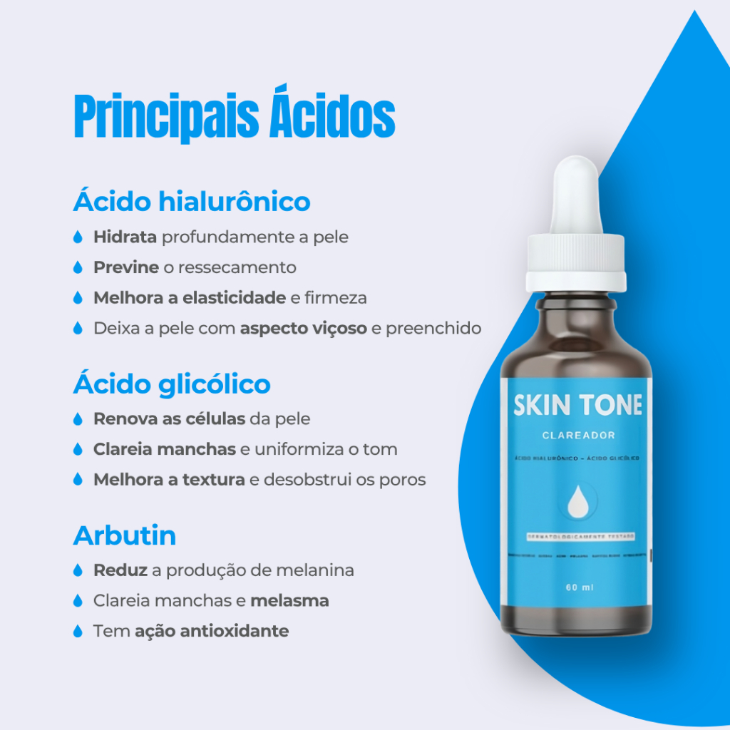 Kit Sérum Clareador + Sabonete Facial + Protetor Solar Tratamento completo para uma pele limpa, uniforme e cheia de vida! Esse kit é ideal para quem busca uma pele limpa, livre de manchas e com um tom mais uniforme. Sabonete Facial Skin Tone – Fórmula 5 em 1: limpa profundamente, desobstrui os poros, controla a oleosidade, combate a acne e mantém a hidratação sem ressecar. Sérum Clareador Skin Tone – Clareia e uniformiza a pele com ácido glicólico, ácido hialurônico e arbutin, tratando melasma, manchas de acne e queimaduras recentes, sem causar efeito rebote. Uso noturno + proteção solar durante o dia. Protetor Solar Skin tone FPS 50 – Quantidade: 50g - Alta proteção UVA/UVB, toque seco, oil free, rápida absorção e resistente à água e suor. Não causa espinhas nem deixa aspecto esbranquiçado. Indicado para todos os tipos de pele. Validade: 2 anos Modo de uso recomendado: ✔ Manhã: Lave o rosto com o sabonete Skin Tone e aplique protetor solar e o creme nas áreas desejadas. ✔ Noite: Lave o rosto com o sabonete, aplique o sérum no rosto e o creme nas áreas desejadas. Um cuidado completo para uma pele linda e saudável todos os dias! Recomendamos o uso por 3 meses para tratamento completo, porém grande parte dos resultados aparecem antes disso, em questão de apenas 14 dias. Tudo depende do grau de suas manchas. CONTRA INDICAÇÕES: Não recomendamos o Sérum Clareador para gestantes e lactantes.