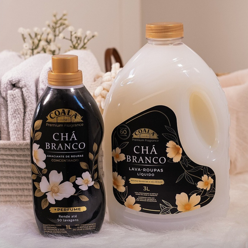 Lava-roupas Líquido Coala Laundry Chá Branco O cuidado com as roupas começa com uma limpeza eficaz e um toque de sofisticação – o Lava-roupas Líquido Coala Laundry Chá Branco foi desenvolvido para quem valoriza alto desempenho aliado a uma fragrância refinada. Sua fórmula exclusiva limpa profundamente, ao mesmo tempo, em que deixa um cheirinho fresco e elegante de Chá Branco. Ideal para o dia a dia, é composto por ativos biodegradáveis e de fontes renováveis que garantem segurança, eficiência e um toque perfumado duradouro nas roupas. Para roupas brancas e coloridas Rende 60 lavagens Super eficaz Super preciso Super cheiroso Modo de Uso: Use 50ml de produto para cada 8Kg de roupa. Lave separadamente roupas brancas e coloridas. Para manchas, aplique diretamente no local, deixe agir por alguns minutos e lave normalmente. Precauções: Mantenha fora do alcance de crianças e animais domésticos. Não manuseie o produto antes de ter lido e compreendido todas as precauções de segurança. Evite contato com os olhos e pele. Em caso de contato, lave imediatamente com água em abundância. Não ingerir. Em caso de ingestão, não provoque vômito. Armazene em local fresco, seco, ventilado, protegido da luz e do calor. Não reutilize a embalagem para outros fins. Amaciante de Roupas Concentrado Coala Laundry Chá Branco. O cuidado com as roupas se transforma em um gesto de sofisticação com o Amaciante de Roupas Concentrado Coala Laundry Chá Branco. Sua fórmula premium amacia as fibras e envolve os tecidos com um cheirinho fresco, leve e elegante. Ideal para quem busca mais conforto no dia a dia com consciência ambiental, ele é formulado com ativos de fontes renováveis, é não irritante e biodegradável. Extrema maciez Mais perfume por mais tempo 1L = 4L Rende 50 lavagens Modo de Uso: Use ½ tampa por lavagem. Aplique no compartimento da máquina ou dilua na água do último enxágue. No tanque, deixe agir por 5 minutos. A linha Coala Laundry transforma o cuidado com as roupas em um momento especial. Com cheirinhos cuidadosamente desenvolvidos, oferecemos alto desempenho, perfume encantador e toque de sofisticação para o dia a dia.