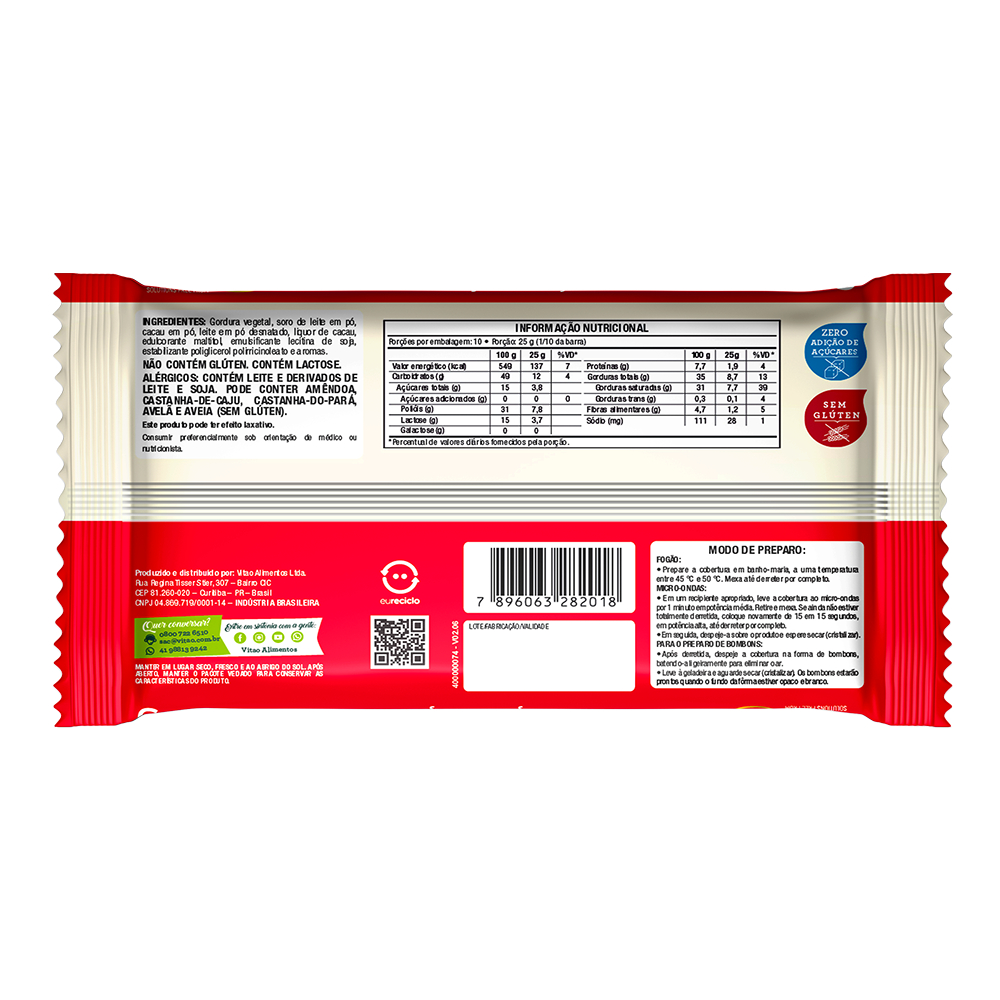 A Cobertura de Chocolate ao Leite Vitao Zero Adição de Açúcares é uma opção deliciosa e saudável, desenvolvida especialmente para quem segue dietas restritas em açúcar e glúten, ou para quem busca um estilo de vida equilibrado, mas sem abrir mão do sabor. Ideal para cobrir bolos, tortas e outras preparações, também pode ser utilizada em receitas como alfajores, pão de mel e bombons, sem necessidade de temperagem. Disponível em barras de 250 g, prontas para o uso (bastando derreter), esta cobertura não contém gordura vegetal hidrogenada, sendo uma escolha mais saudável para o equilíbrio do organismo. INGREDIENTES: Gordura vegetal, soro de leite em pó, cacau em pó, leite em pó desnatado, liquor de cacau, edulcorante maltitol, emulsificante lecitina de soja, estabilizante INS 476 e aromas. ALÉRGICOS: CONTÉM DERIVADOS DE LEITE E SOJA. PODE CONTER AMÊNDOA, CASTANHA-DE-CAJU, AVELÃ E AVEIA (SEM GLÚTEN). NÃO CONTÉM GLÚTEN. CONTÉM LACTOSE. SEM GLÚTEN, ZERO ADIÇÃO DE AÇÚCARES.
