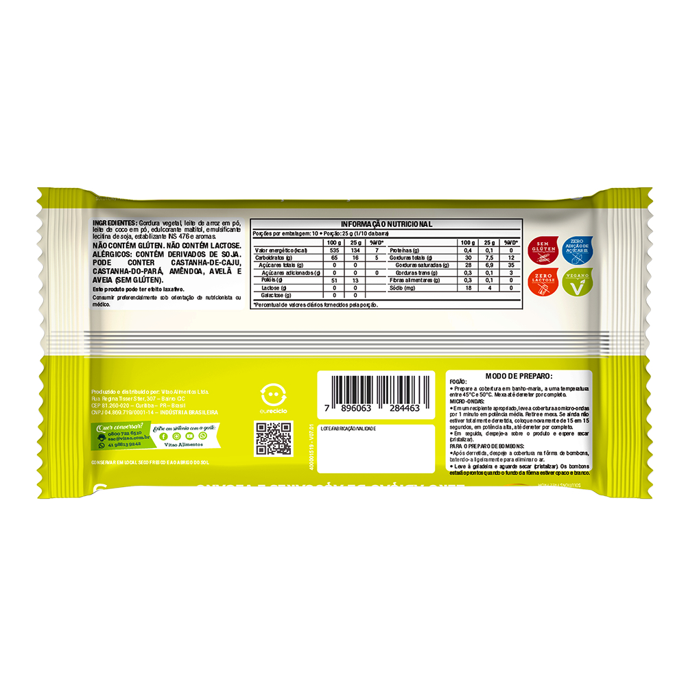 A Cobertura de Chocolate Branco Vegano Vitao é a escolha perfeita para quem segue dietas restritivas de açúcar, glúten e lactose, mas não quer abrir mão do sabor. Esta cobertura é livre de açúcares adicionados e sem glúten, proporcionando uma opção deliciosa e saudável para suas preparações. Ideal para cobrir bolos, tortas, alfajores, pão de mel e bombons, sem a necessidade de temperagem, ela se torna super prática para o seu dia a dia. Disponível em barras de 250 g, a cobertura pode ser derretida facilmente, permitindo que você crie sobremesas incríveis de maneira simples. Além disso, por não conter gordura vegetal hidrogenada, é uma escolha mais equilibrada para quem deseja uma alimentação saudável sem abrir mão do prazer. INGREDIENTES: Gordura vegetal, leite de arroz em pó, leite de coco em pó, edulcorante maltitol, emulsificante lecitina de soja, estabilizante INS 476 e aromas. ALÉRGICOS: CONTÉM DERIVADOS DE SOJA. PODE CONTER CASTANHA-DE-CAJU, CASTANHA-DO-PARÁ, AMÊNDOA, AVELÃ E AVEIA (SEM GLÚTEN). NÃO CONTÉM GLÚTEN. NÃO CONTÉM LACTOSE. SEM GLÚTEN, ZERO ADIÇÃO DE AÇÚCARES, ZERO LACTOSE, VEGANO.