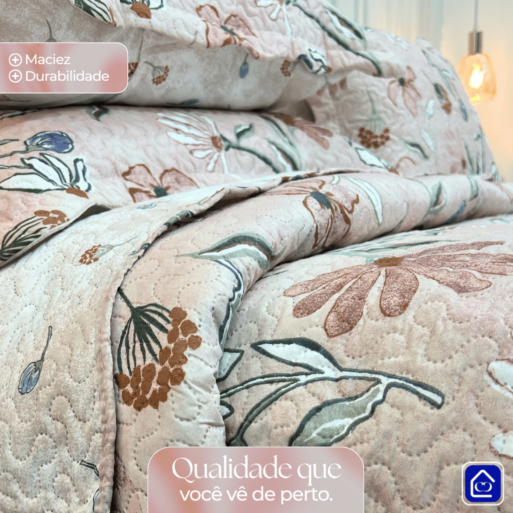 Kit Cobre Leito Colcha King Casal Dupla Face 3 Peças Estampada Floral Matelado Microfibra Boutis Box