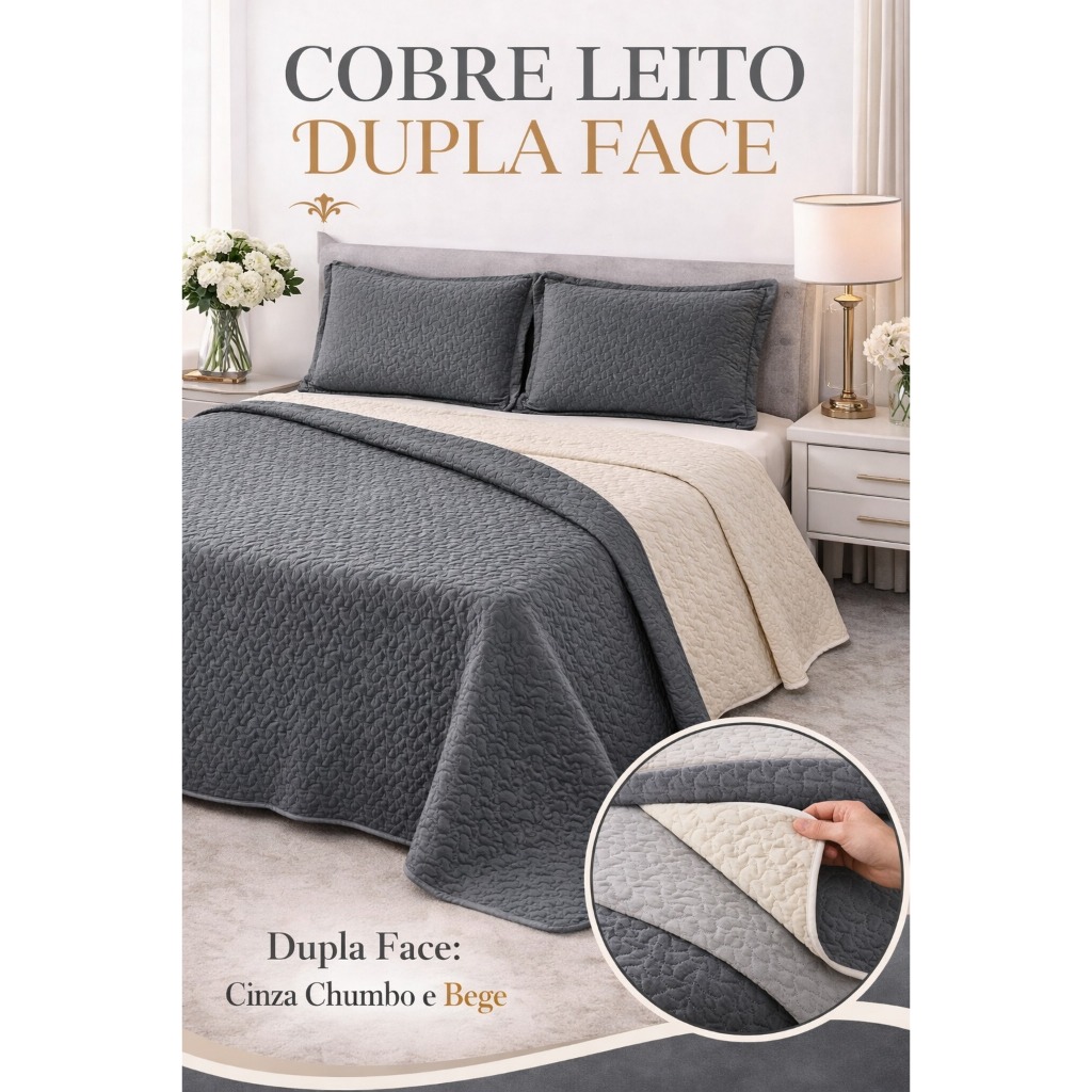 Descrição do produto 🛏️ Sobre o Produto: ✨ Tecido Superior: 100% Poliéster ✨ Tecido Inferior: 100% Poliéster ✨ Enchimento: 100% Poliéster 🎯 Diferenciais: ✔️ Toque macio e Confortavél ✔️ Matelado moderno , com texturas elegantes ✔️ Alta resistência e durabilidade ✔️ Fácil de lavar e secar ✔️ Modelo dupla face: duas opções de uso em um só produto! *Perfeito para quem busca praticidade se abrir mão de estilo. 🖼️ Imagem ilustrativa: o matelassê e a tonalidade podem apresentar pequenas variações. 📦 Itens Inclusos no Kit: • 1 Cobre Leito: 2,40m x 2,60m • 2 Fronha para Travesseiros com zíper: 70cm x 50cm *APROVEITE NOSSAS UNIDADES DISPONIVEL E GARANTA O SEU AGORA! 🚚 Envio rápido e seguro para todo o Brasil! 💬 Em caso de dúvidas, utilize o chat. Estamos prontos para te atender!