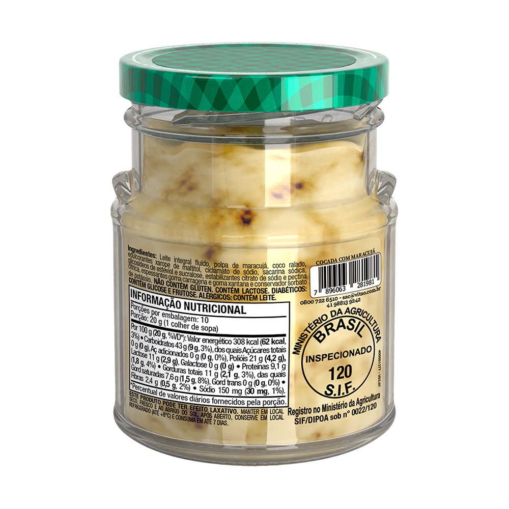 A cocada ao leite com maracujá Vitao é uma deliciosa opção sem açúcar e sem glúten. Indicada para atender às necessidades de pessoas que seguem dietas restritas, mantém o sabor irresistível. Produzida em um ambiente livre de contaminação por glúten, garante a segurança para os intolerantes. Versátil e prática, pode ser consumida diretamente ou utilizada como ingrediente em diversas receitas. Mesmo sem adição de açúcares, não apresenta gosto residual de adoçante, assemelhando-se às cocadas ao leite tradicionais. Ideal para quem busca uma opção saudável e saborosa. INGREDIENTES: Leite integral fluído, polpa de maracujá, coco ralado, edulcorantes xarope de maltitol, ciclamato de sódio, sacarina sódica, glicosídeos de esteviol e sucralose, estabilizantes citrato de sódio e pectina cítrica, espessantes goma carragena e goma xantana e conservador sorbato de potássio. ALÉRGICOS: CONTÉM LEITE. NÃO CONTÉM GLÚTEN. CONTÉM LACTOSE. DIABÉTICOS: CONTÉM GLICOSE E FRUTOSE. SEM GLÚTEN, ZERO ADIÇÃO DE AÇÚCARES.