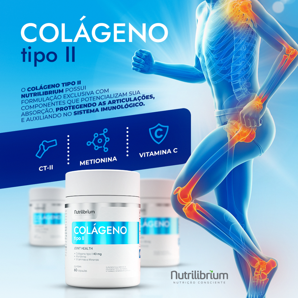 COLLAGEN HIALURON INGREDIENTES: Peptídeos Bioativo de Colágeno Hidrolisado com peso molecular média 2kDa®, Ácido Hialurônico (Hialuronato de Sódio), Vitamina C (Ácido Ascórbico), Vitamina E (Acetato de DL-alfa-tocoferol), Zinco (Sulfato de Zinco Monoidratado), Vitamina A (Acetato de Retinol), Biotina (D-Biotina), Selênio (Selenito de Sódio) e Antiumectante Estearato de Magnésio. INGREDIENTES DA CÁPSULA: Gelatina, Água Purificada e Corante Dióxido de Titânio. SUGESTÃO DE USO: Consumir 3 (três) cápsulas 1(uma) vez ao dia. PRODUTO INDICADO PARA MAIORES DE 19 ANOS. ADVERTÊNCIAS: “ESTE PRODUTO NÃO É UM MEDICAMENTO”. “NÃO EXCEDER A RECOMENDAÇÃO DIÁRIA DE CONSUMO INDICADA NA EMBALAGEM”. “MANTENHA FORA DO ALCANCE DE CRIANÇAS”. “ESTE PRODUTO NÃO DEVE SER CONSUMIDO POR GESTANTES, LACTANTES E CRIANÇAS”. CONSERVAÇÃO: Manter em lugar fresco, não úmido e ao abrigo de luz. Não consumir o produto se o lacre de proteção estiver violado. Após aberto, consumir preferencialmente em 60 dias. _____________________________________________ COLÁGENO TIPO 2 INGREDIENTES: L-Metionina, Colágeno Tipo II (Colágeno de frango com colágeno tipo II não desnaturado), Vitamina C (Ácido Ascórbico), Cobre (Sulfato Cúprico), Vitamina K (Fitomenadiona), Selênio (Selenito de Sódio), Vitamina D3 (Colecalciferol) e Antiumectantes Talco Farmacêutico e Dióxido de Silício. INGREDIENTES DA CÁPSULA: Gelatina, Água Potável Filtrada e Corante Dióxido de Titânio. NÃO CONTÉM GLÚTEN SUGESTÃO DE USO: Consumir 1 (uma) cápsula 1 (uma) vez ao dia. PRODUTO INDICADO PARA MAIORES DE 19 ANOS. ADVERTÊNCIAS: “ESTE PRODUTO NÃO É UM MEDICAMENTO”. “NÃO EXCEDER A RECOMENDAÇÃO DIÁRIA DE CONSUMO INDICADA NA EMBALAGEM”. “MANTENHA FORA DO ALCANCE DE CRIANÇAS”. “ESTE PRODUTO NÃO DEVE SER CONSUMIDO POR GESTANTES, LACTANTES E CRIANÇAS”. CONSERVAÇÃO: Manter em lugar fresco, não úmido e ao abrigo de luz. Não consumir o produto se o lacre de proteção estiver violado. Após aberto, consumir preferencialmente em 80 dias.