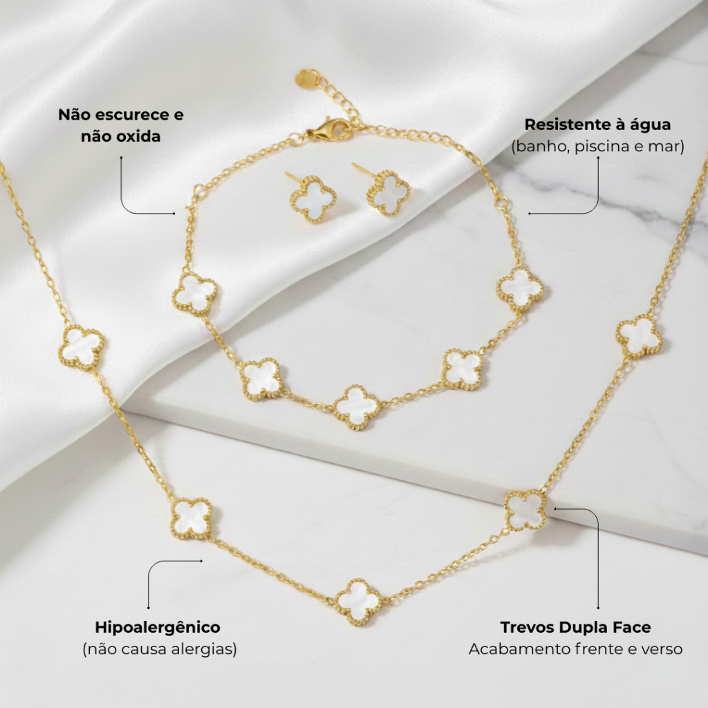 Kit Colar Choker Pulseira E Brinco Trevo Branco Gargantilha Sorte Luxo Elegante Aço Inox Dourado