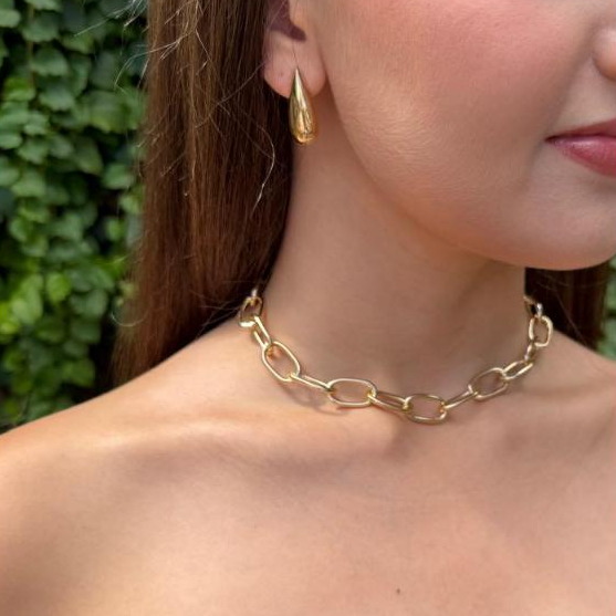 Kit Colar Elo Fino Dourado Brinco Gota Corrente Choker Feminino Conjunto Elos Gargantilha