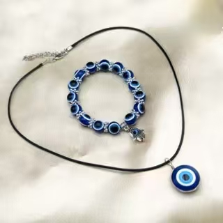 Kit Colar Pulseira Clássica Acrílica com Contas de Olho Nazar e Mão Hamsa - Amuleto de Sorte em
