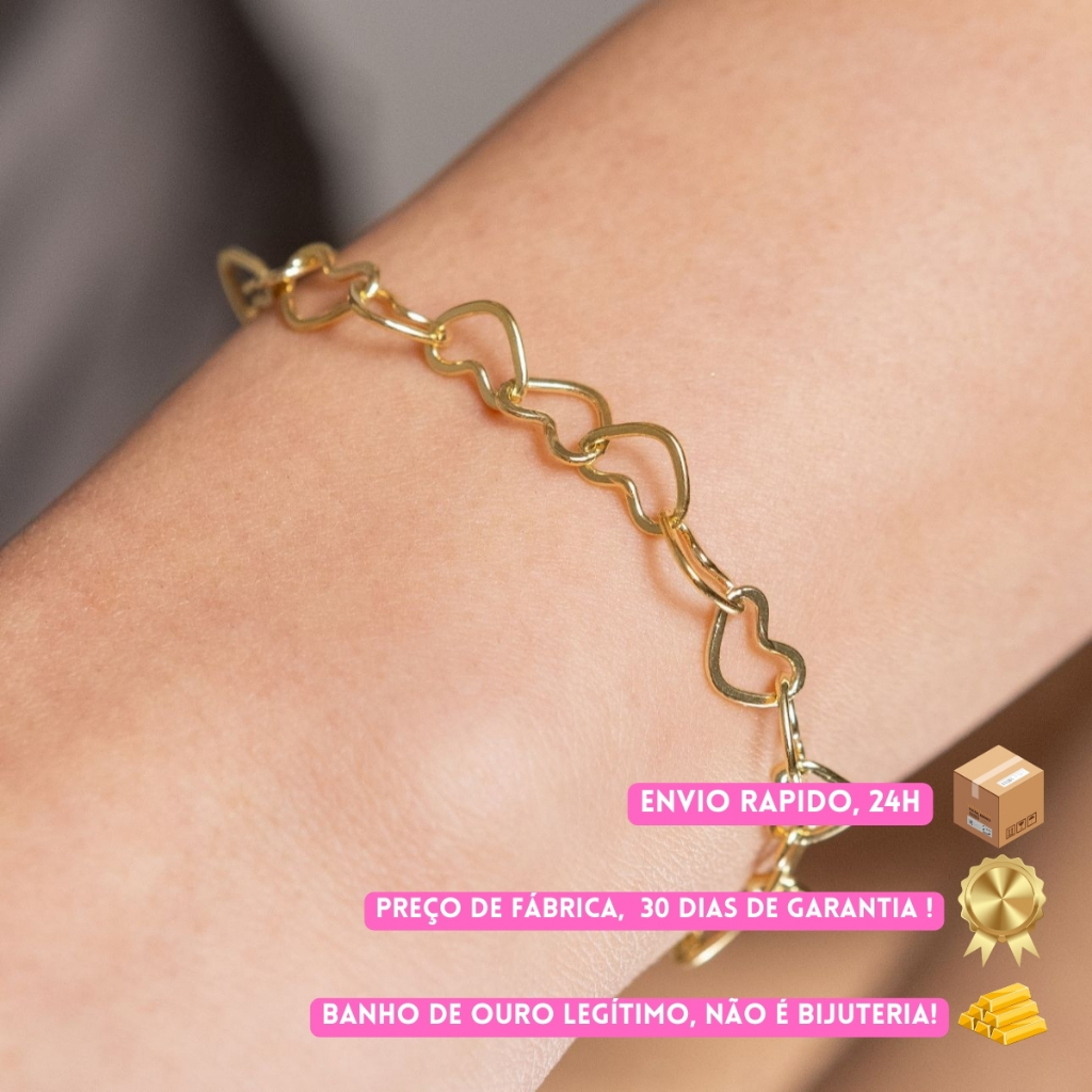 Kit Colar + Pulseira Feminino Corações Vazado Luxo Banhado em Ouro 18k Atacado e Revenda