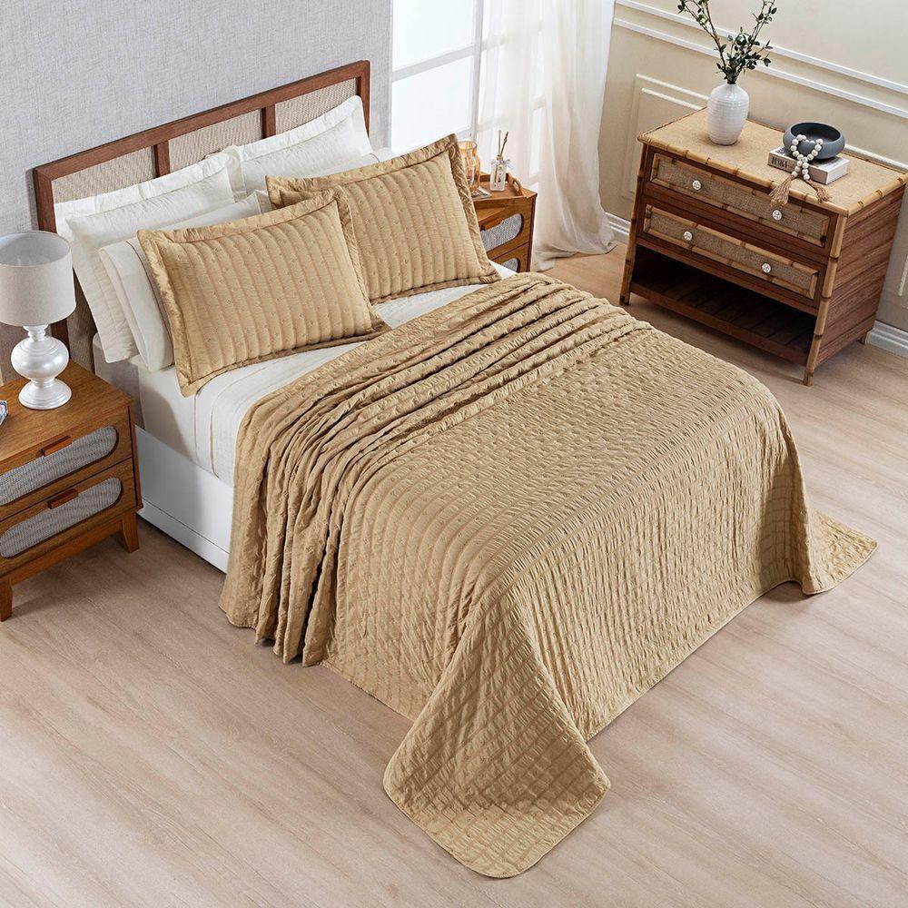 Kit Colcha Cobre Leito Scarpa Plissê Queen Seersucker 3 Peças Maciez E Leveza Textura Bege Mel
