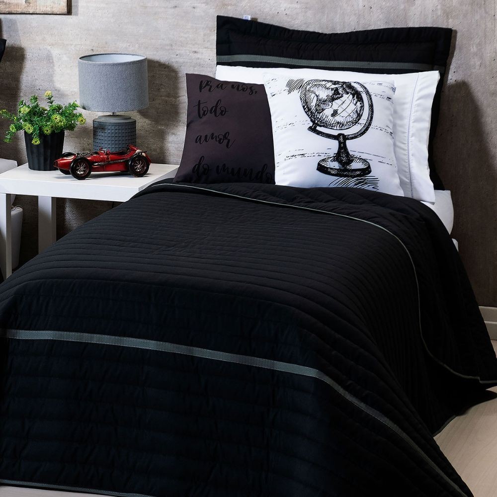 Kit Roupa de Cama 4 Peças SOLTEIRO Inove Renove o visual do seu quarto com nosso incrível e confortável Kit Inove. Surpreenda-se com o conforto e maciez do tecido. O kit é composto por um cobre leito matelassado dupla face preto com detalhe de viés, UM porta travesseiro também matelassado com detalhe de viés colorido e duas capas de almofadas estampadas digitalmente, com estampa apenas na parte frontal e zíper invisível super discreto. CONTÉM NA EMBALAGEM: 01 Cobre Leito Matelassado Dupla Face 2,45m x 1,90m 01 Portas Travesseiros com Debrum 70cm x 50cm 02 Capas de Almofada 45cm x 45cm Composição Cobre Leito e Portas Travesseiros: Tecido Percal 200 Fios 100% Poliéster Manta (interna) 100% Poliéster Composição Capa de Almofada: Tecido Oxford 100% Poliéster PERGUNTAS FREQUENTES: Vendem as capas separadamente? Não, nossos kits são fabricados e embalados todos em conjuntos É dupla face? É sim, cobre leito dupla face para melhor atender nossos clientes com qualidade e preços incriveis