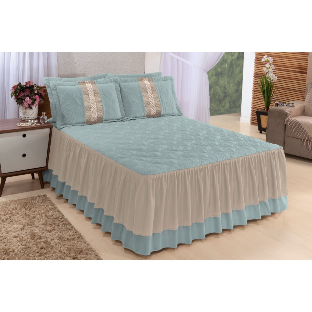 Kit Colcha Moderna Betina Queen Size 03 Peças Jodo de Cama Box - Azul turquesa Babado Cobre Leito