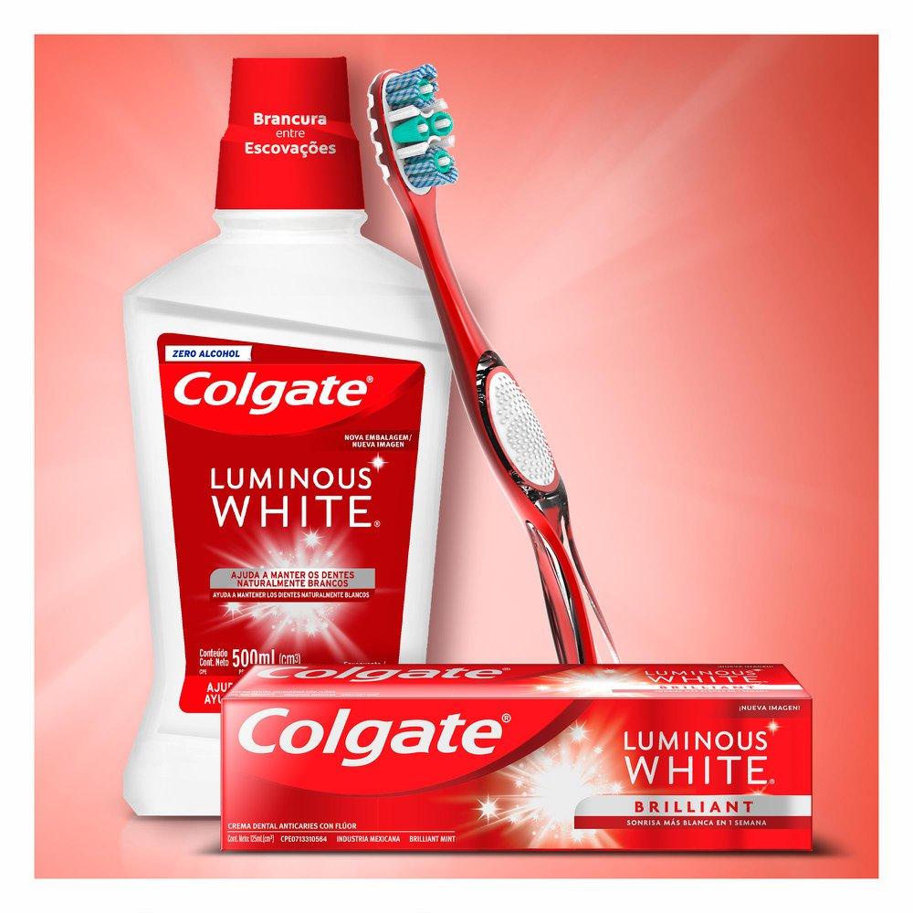 Kit Contém: Colgate Creme Dental 140g + Escova Dental Leve 2 Pg 1 + Enxaguante Bucal 500ml - Grátis 1 Creme Dental Creme dental O creme dental clareador Colgate Luminous White Brilliant é um creme que contém uma poderosa tecnologia de clareamento dental para um sorriso mais branco em 1 semana. Benefícios para você: O creme dental clareador Colgate Luminous White tem uma tecnologia exclusiva com micro cristais que aceleram o clareamento dental. Poderoso removedor de manchas para um sorriso cada vez mais lindo e saudável. Remineraliza e protege o esmalte do dente. O uso contínuo do creme dental clareador ajuda a manter os dentes mais brancos por mais tempo. Esse creme dental auxilia na prevenção da formação de tártaro. Revela o poder de um sorriso irresistível. Enxaguante Bucal Este enxaguante bucal para clareamento dental Colgate Luminous White proporciona o branqueamento dos dentes e uma higienização perfeita, com um hálito refrescante como você sempre quis. Escova de Dentel A escova de dente para branqueamento dental Colgate 360° Luminous White Advanced proporciona dentes mais brancos a partir da 1ª escovação e promove uma higiene bucal completa. Sua tecnologia exclusiva proporciona a limpeza dos dentes, língua, bochechas e gengiva. *vs escova regular de cerdas planas