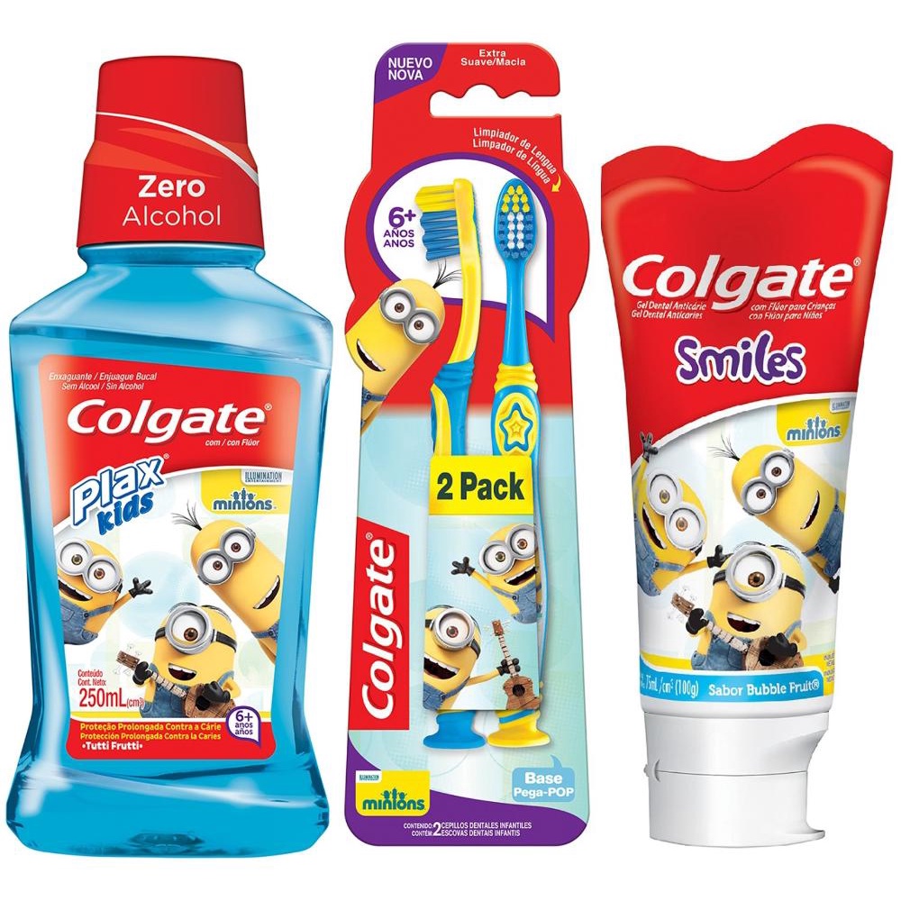 Creme Dental Colgate Smiles Minions 100g Escova Dental Colgate Smiles Minions 6+ Anos 2 Unidades Enxaguante Bucal Colgate Plax Kids Minions 250ml