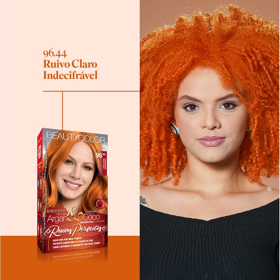 Kit BeautyColor Ruivos Perfeitos 96.44 - Ruivo Claro Indecifrável, tem formulação tecnológica que contribui para saúde dos cabelos mantendo sedosos e com brilho. É a coloração certa para um ruivo intenso e tem ótima cobertura de fios brancos, retém mais de 65% da cor com muito mais tempo de duração! O Kit BeautyColor Ruivos Perfeitos 96.44 - Ruivo Claro Indecifrável, tem em sua coloração um sistema inovador, o Color b-lock, que trabalha na fixação e proteção dos pigmentos no interior do fio, essa tecnologia mantém a cor intensa e radiante por mais tempo, contém Arginina, Proteção UV, Antioxidante e Blend de óleos rico em argan & coco + aminoácido essenciais. Além disso o Kit BeautyColor Ruivos Perfeitos 96.44 - Ruivo Claro Indecifrável, tem um tom único para cabelo ruivo, incrível né? #DicaBelezaRuivaAtenção ao teste de mecha e prova de toque!Antes de qualquer mudança em seu cabelo, é importante fazer esses testes para ter a certeza de que não terá nenhuma reação química ou alérgica ou até mesmo verificar se a cor do ruivo ficará do seu agrado.Para saber se você terá alguma reação química, aplique a coloração BeautyColor Ruivos Perfeitos 96.44 - Ruivo Claro Indecifrável em uma pequena mecha na parte de trás do cabelo. Aguarde 40 minutos. Após o tempo de pausa, lave e seque a mecha, se ele estiver lindo e brilhante, na cor que você deseja, se jogue nessa tonalidade de ruivo! O kit contém:01 Bisnaga De Coloração Creme BeautyColor 96.44 Ruivo Claro Indecifrável - 45g01 Frasco Aplicador De Emulsão Reveladora - 67,5ml01 Sache Máscara De Hidratação Máxima - 15ml01 Sérum Intensificador De Brilho Antitérmico - 2ml01 Par De Luvas PrecauçõesPode causar irritação na pele de determinadas pessoas.Não usar nos cílios e sobrancelhas.Não aplicar se o couro cabeludo estiver irritado ou lesionado. Em caso de contato com os olhos, lavar imediatamente com água em abundância.Não recomendamos a utilização deste produto em gestantes.Usar luvas adequadas.Manter fora do alcance de crianças.ResultadoSeu cabelo com uma cor vibrante, hidratados e radiantes! Agora é sair por aí desfilando sua Beleza Ruiva!