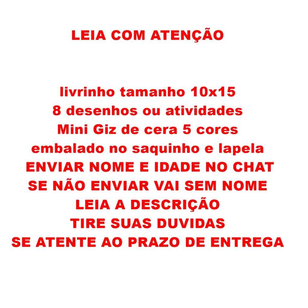 LEIA COM ATENÇÃO: Kit para colorir Kit composto com Um livrinho tamanho aproximado 10x15cm pequeno ou 14x21 grande 8 desenhos ou atividades podem variar Mini Giz de cera tamanho aproximado 5cm no kit pequeno e Giz grande 6 cores no kit grande Já vai embalado um a um, no saquinho e lapela personalizada Material utilizado Papel fotográfico na capa, lapela e giz Miolo do livrinho feito em papel offset (sulfite) Cores podem sofrer alteração por conta do monitor/celular Não mandamos arte pra aprovação Só incluímos nome e idade, mandar após a compra, se não mandar vai só no tema sem o nome