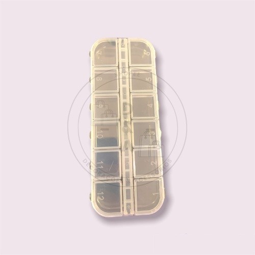 -Porta comprimidos retangular com 12 divisões. -Prático e funcional, protege sua medicação e evita o esquecimento, se já tomou ou não, pois cada compartimento é marcado com um dia da semana. Você pode guardar mais de um comprimido ou cápsula no mesmo compartimento. -Comprimento 13 cm, largura 5 cm, altura 1,5 cm. -Material: Plástico. -Cor; transparente