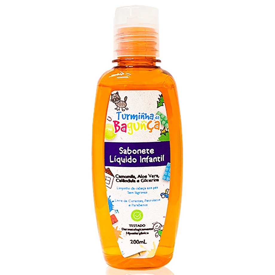 NÃO CONTÉM VALVULA PUMP Sabonete Liquido 200 ml Turminha da Bagunça Infantil Vegano Hipoalergenico Camomila, Aloe Vera, Calêndula e Glicerina Limpinho da cabeça aos pés Sem Lagrimas Livre de corantes, Petrolatos e Parabenos Testado Dermatatologicamente Hipoalergenico Sabonete desenvolvido com ativos emolientes, extratos vegetais e glicerina que proporcionam uma limpeza suave ao corpo e ao cabelo. Deixando a pele perfumada e hidratada. Composição: Agua; Lauril, Sulfato de Sódio; Cocoanfoacetato de Sódio; Cocoamidopropil Betaina; Dissódio Laurete Sulfossuccinato: Dietanolamina Cocamida; Perfume; Lauril Glucosideo; Cloreto de Sódio; Poliquatério = 10; Cloreto de Hidroxipropiltrimônio de Guar; PEG – 150 Diestearato: Acido Cítrico; Edetato de Dissódico: Metilcloroisotiazolinona / Metilisotiazolinona; Extrato de Aloe Vera: Extrato de Camomila: Extrato de Calêndula; Óleo de Lavanda; Glicerol Validade: todos os nossos produtos possuem validade de três anos, são produzidos e vendidos dentro de seis meses, ou seja, você desfruta de produtos frescos e de alta qualidade por longos três anos após a compra. Esse anúncio contém: 3 Sabonetes Liquido de 200 ml da Turminha da Bagunça