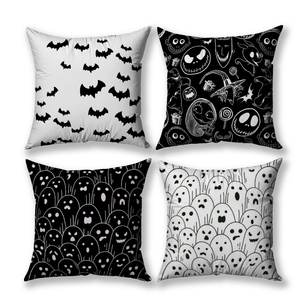 Kit Com 04 Capas Para Almofadas Halloween Preto e Branco Oxford Quarto Sala Estampas Bibi Painéis
