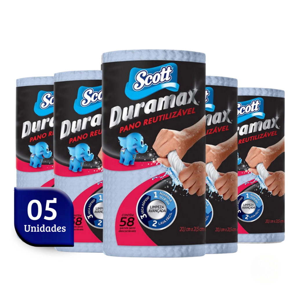 Kit com 05 Panos Multiuso Azul Duramax Scott Experimente a evolução da limpeza! O pano Scott Duramax Rolo resolve essas e outras emergências de maneira rápida, prática e higiênica! São mais absorventes e resistentes que papel toalha, podendo ser lavados e reutilizados ou simplesmente descartados, dependendo da sujeira. Cor: Azul Dimensões do Pano: 20,1cm x 21,5cm (LxC) Embalagem: 05 rolos contém 58 panos cada
