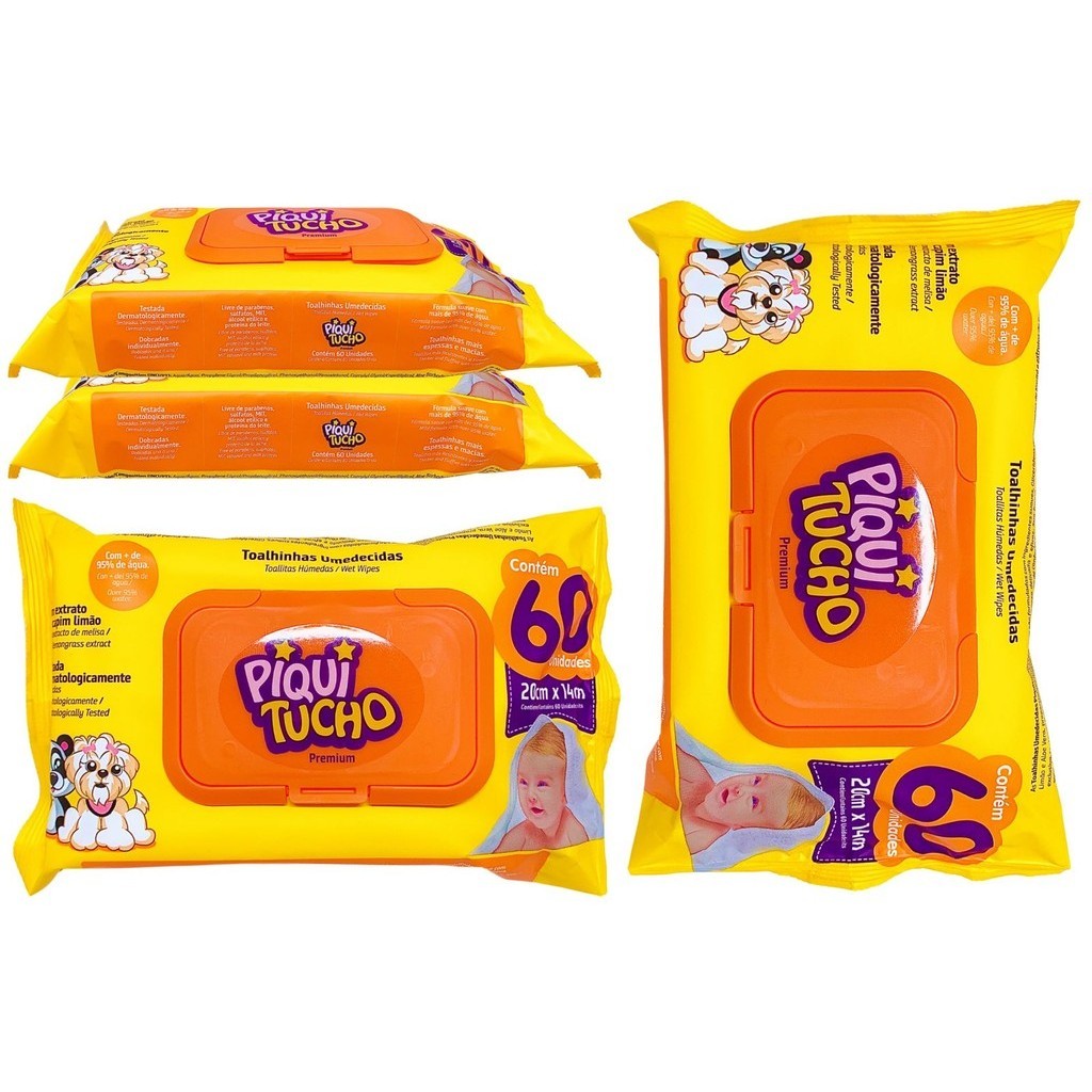 KIT COM 06 PACOTES DE LENÇO/TOALHAS UMEDECIDAS PARA BEBE PIQUITUCHO PREMIUM C/60 UNIDADES CADA