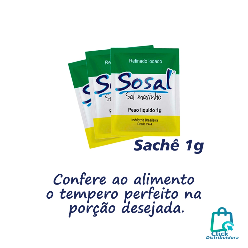 Kit com 1.000 unidades Sal Marinho Sosal Sachê 1gr Ingredientes : Cloreto de sódio, Iodato de Potássio, Antiumectante ferrocianeto de sódio INS 535 Não Contém Glúten Marca de alta qualidade porporcionado satisfação e tempero na medida certa Envio Imediato!!