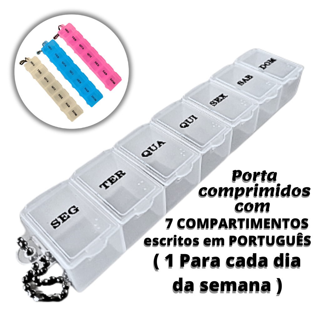OLÁ! TUDO BEM? SOMOS A LOJA 10UTIL. TODOS OS PRODUTOS COM NOTAL E GARANTIA. COMPRA 100% SEGURA RECEBA O PRODUTO OU O DINHEIRO DE VOLTA TEMOS TODOS OS PRODUTOS EM ESTOQUE PARA ENVIO IMEDIATO ### SEPARE SEUS COMPRIMIDOS COM MUITA PRATICIDADE, PODENDO CARREGÁ-LOS COM VOCÊ PARA ONDE PRECISAR COM FACILIDADE ### **** Kits Com1, 2, 3 ou 7 Porta Comprimidos Com 7 Divisórias Cada Sendo Uma Divisória Para Cada Dia Da Semana **** Se você é alguém que precisa fazer uso regular de medicamentos ou suplementos, sabe como pode ser desafiador lembrar de tomar as doses corretas todos os dias. Com o porta comprimidos semanal, você nunca mais terá que se preocupar com isso! Imagine não ter mais que lembrar de quantas pílulas tomar em cada horário, ou carregar frascos de medicamentos por aí. Com esse porta comprimidos semanal, tudo fica mais simples. Com compartimentos separados para cada dia da semana, você pode organizar seus comprimidos e cápsulas com antecedência, tornando o processo de tomar os medicamentos muito mais conveniente. Benefícios do produto: ** KITS COM 1, 2, 3 OU 7 UNIDADES ** PORTA COMPRIMIDOS COM 7 DIVISÓRIAS ( 1 divisória para cada dia da semana ) ** EVITA QUE SEUS MEDICAMENTOS FIQUEM EXPOSTOS AO AR OU UMIDADE ( Mantem a eficácia por muito mais tempo ) ** TAMPAS COM TRAVAS RESISTENTES ( Não abrem sozinhas ) ** MARCAÇÕES EM PORTUGUÊS ( Maior facilidade para você ) ** TAMANHO COMPACTO ( Carregue sempre com você com muita facilidade, seja na mala ou no bolso ) Medidas do produto: Comprimento: 15 cm Largura: 3 cm Altura: 2,2 cm Quantidade de compartimentos: 7 Cores: Rosa, Azul e Transparente ( Cores enviadas aleatórias conforme a disponibilidade de estoque ). Escolha a quantidade desejada clicando ao lado das fotos do anúncio onde está escrito QUANTIDADE. ATENÇÃO: O anúncio se refere a 1 ( Um ) kit com 1, 2, 3 ou 7 Porta Comprimidos enviados em cores aleatórias conforme a disponibilidade de estoque, os demais objetos que ambientam as fotos NÃO ACOMPANHAM os porta comprimidos. A LOJA 10UTIL trabalha com a garantia SHOPEE, ou seja, receba seu produto, ou o dinheiro de volta. ( Compra 100% Segura ) Todos os nossos produtos são rigorosamente conferidos antes do envio para nos certificarmos de que está tudo de acordo com o anunciado. Assim evitamos possíveis transtornos desnecessários. Isso é RESPEITO COM NOSSOS CLIENTES. Você tem até 7 dias de garantia do vendedor contra defeitos de fabricação. TEMOS O PRODUTO EM ESTOQUE. ENVIAREMOS EM ATÉ 24 HORAS ÚTEIS. Caso queira conhecer mais alguns de nossos produtos é só clicar em VER PÁGINA DA LOJA que fica logo abaixo das fotos do anúncio. AGRADECEMOS SUA VISITA E BOAS COMPRAS!!