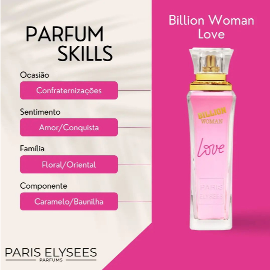 O perfume Billion Casino Royal Masculino da Paris Elysees é uma fragrância luxuosa e refinada, inspirada no homem que sabe jogar e ganhar. É um perfume amadeirado especiado, com notas de saída de maçã, bergamota e canela, notas de coração de lavanda, gerânio e cravo, e notas de fundo de sândalo, vetiver e musgo de carvalho. Família Olfativa: Amadeirada e Aromática Notas de Coração: Cardamomo, Coentro, Gerânio e Lavanda Notas de Fundo: Fava Tonka, Líquen, Madeira, Teca e Vetiver Notas de Saída: Laranja Paris Elysees apresenta o Billion Woman Love que faz parte da sua coleção de perfumes femininos Champs Elysees, uma seleção de fragrâncias originais que trazem a todas as mulheres uma viagem na avenida mais bonita do mundo. O Billion Woman Love da Paris Elysees lhe dá modernidade, elegância, distinção e refinamento. Billion Woman Love lhe dá o toque francês da mulher parisiense imaginado e criado pela Paris Elysees. É composto por notas frescas, leves, suaves e ainda conta com uma super fixação, te deixando cheirosa por todo o dia. Família Olfativa: Floral e Oriental Notas de Cabeça: Laranja Notas de Coração: Violeta e Notas Florais Notas de Fundo: Caramelo, Musgos e Baunilha