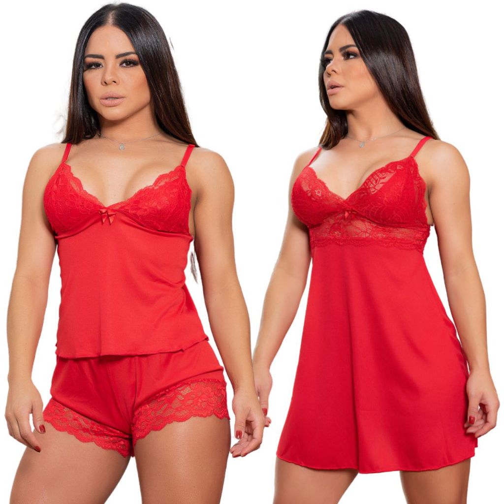 K it com 1camisola feminina com renda e calcinha sexy e 1 baby doll short doll pijamas Em Promoção! Kit Composto de 1 Camisola sensual + Calcinha Fio Dental + Baby doll short doll Quem não gosta de uma bela peça sensual ? Em uma ocasião especial ? Ele deixa a mulher mais feminina e atraente. Nossas pecas são indicados para uso casual e ocasiões mega especiais. A Camisola sexy luxo tem busto em renda forrado com microfibra, seu tecido é extremamente confortável e se ajusta nas curvas do seu corpo, deixando-a poderosamente sexy. Tecido de Helanca Premium: Nosso baby doll é confeccionado com helanca de alta qualidade, que é macia ao toque, leve e proporciona um ajuste perfeito. -->Tamanhos disponíveis a pronta entrega P | M | G | GG --> TABELA DE MEDIDAS : P veste do 36 ao 38 M veste do 38 o 40 G veste do 40 ao 42 GG veste do 42 ao 44 Temos o envio mais rápido compre e receba o seu pedido no conforto da sua casa fazemos o envio de seu pedido em ate 24 horas após a confirmação do pagamento qualquer duvida estaremos disponíveis no chat