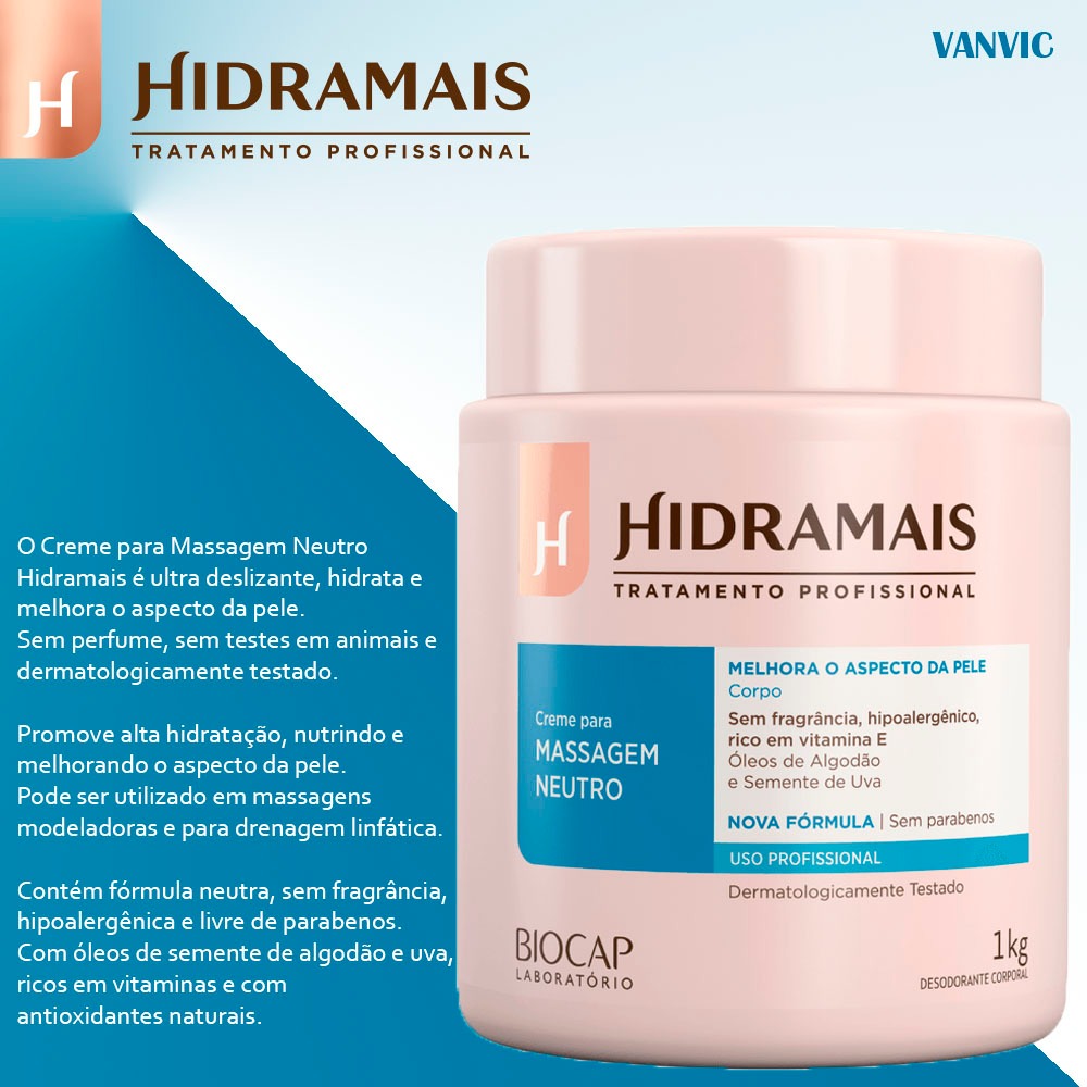 ITENS INCLUSOS: - 1 Creme Hidramais para Massagem Neutro 1kg. - 1 Creme Hidramais para Massagem Localizada 1kg. Produto 100% Original, com garantia e nota fiscal. ______ O Creme para Massagem Neutro Hidramais é ultra deslizante, hidrata e melhora o aspecto da pele. Sem perfume, sem testes em animais e dermatologicamente testado. O que ele faz? Promove alta hidratação, nutrindo e melhorando o aspecto da pele. Pode ser utilizado em massagens modeladoras e para drenagem linfática. O que ele tem? Contém fórmula neutra, sem fragrância, hipoalergênica e livre de parabenos. Com óleos de semente de algodão e uva, ricos em vitaminas e com antioxidantes naturais. Como usar? Com uma espátula, retire o produto e aplique na pele, fazendo movimentos leves e circulares com as pontas dos dedos até a sua completa absorção. Sem parabenos. Protocolo: Recomendado em todos os protocolos que tem por objetivo melhorar a circulação, metabolismo, combater a celulite, promovem relaxamento, auxiliam e eliminam a gordura localizada. Caso apareça alguma irritação, suspenda imediatamente o uso. Não use sobre a pele lesionada ou irritada. Em contato com os olhos, lave com água corrente. Mantenha fora do alcance de crianças. Este produto foi formulado de maneira a minimizar possível surgimento de alergias. Recomenda-se o uso de espátula para a retirada o produto da embalagem, a fim de evitar a contaminação do mesmo. ______ O Creme para Massagem Localizada Hidramais possui uma alta concentração de ativos com ações anti-inflamatórias, antioxidante e redutora. Indicado para tratamentos estéticos de remodelagem corporal. Produto sem teste em animais e dermatologicamente testado. O que ele faz? O Creme para Massagem Localizada Hidramais age ativando a microcirculação, prevenindo o aparecimento de estrias e varizes, além de eliminar a retenção de líquido. O que ele tem? Contém diversos ativos, como Phytocafeil, que possui ação anti-inflamatória localizada, contribuindo para drenagem superficial dos líquidos retidos, além de previnir e reduzir a formação de tecido adiposo. Conta também com Castanha da Índia, de ação adstringente e de ativação da circulação periférica; Centella Asiática, que auxilia na produção do colágeno e permite o tratamento da celulite localizada; e Ginkgo Biloba, antioxidante de ação protetora contra os radicais livres. Como usar? Permitido para gestantes. Modo de usar: Com uma espátula, retire o produto e aplique na pele, massageando até a sua completa absorção. Protocolo: Passo 1: Realize a higienização com o FLUIDO PREBIÓTICO HIGIENIZANTE HIDRAMAIS. Passo 2: Aplique o GEL ESFOLIANTE HIDRAMAIS sobre a região a ser trabalhada, fazendo movimentos leves até atingir esfoliação que desejar. Borrife água para retirada do produto e enxugue. Passo 3: Aplique GOMAGEM DE ARGILA BRANCA HIDRAMAIS e deixe em tratamento por 10 minutos, ou até que o produto seque completamente. Remova em forma de rollings. Passo 4: Realize massagens com O CREME PARA MASSAGEM LOCALIZADA até sua completa absorção. Para uma massagem mais intensiva, indica-se o uso do CREME TERMOATIVADO HIDRAMAIS com nicotinato de metila. Passo 5: Finalize com a aplicação do FLUIDO TÉRMICO COM NICOTINATO DE METILA em todo o corpo.