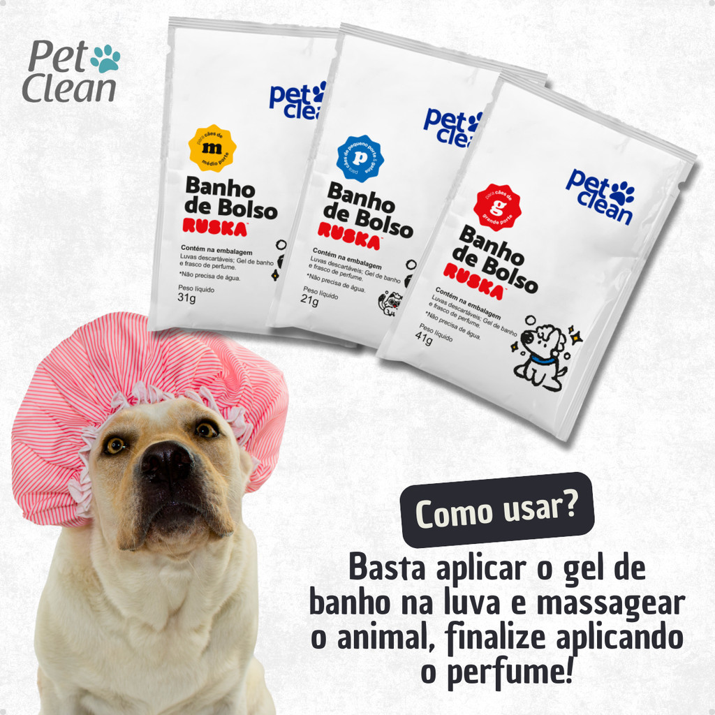 ANÚNCIO SORTIDO COM PROMOÇÃO ESPECIAL! Variações: 1x Banho de Bolso 3x Banhos de Bolso 5x Banhos de Bolso Obs: Podendo variar entre tamanho p, m ou g. Banho a Seco Portátil para Cães e Gatos – Kit 3 em 1 Higiene rápida e prática onde você estiver! Seu pet sujou durante o passeio ou está com cheirinho ruim? Resolva em minutos com nosso kit de banho a seco de bolso. Compacto, leve e eficiente! Cada Unidade Contém: 1x luva descartável para aplicar 1x sachê de shampoo sem enxágue Pet Clean 1x frasco de perfume Pet Clean Como usar: Abra o sachê e coloque o shampoo na luva Esfregue no pet com movimentos suaves Finalize com o perfume e pronto! Importante: Cada unidade é de uso ÚNICO! Ideal para levar em passeios, viagens ou emergências. Sem necessidade de água, sem bagunça!